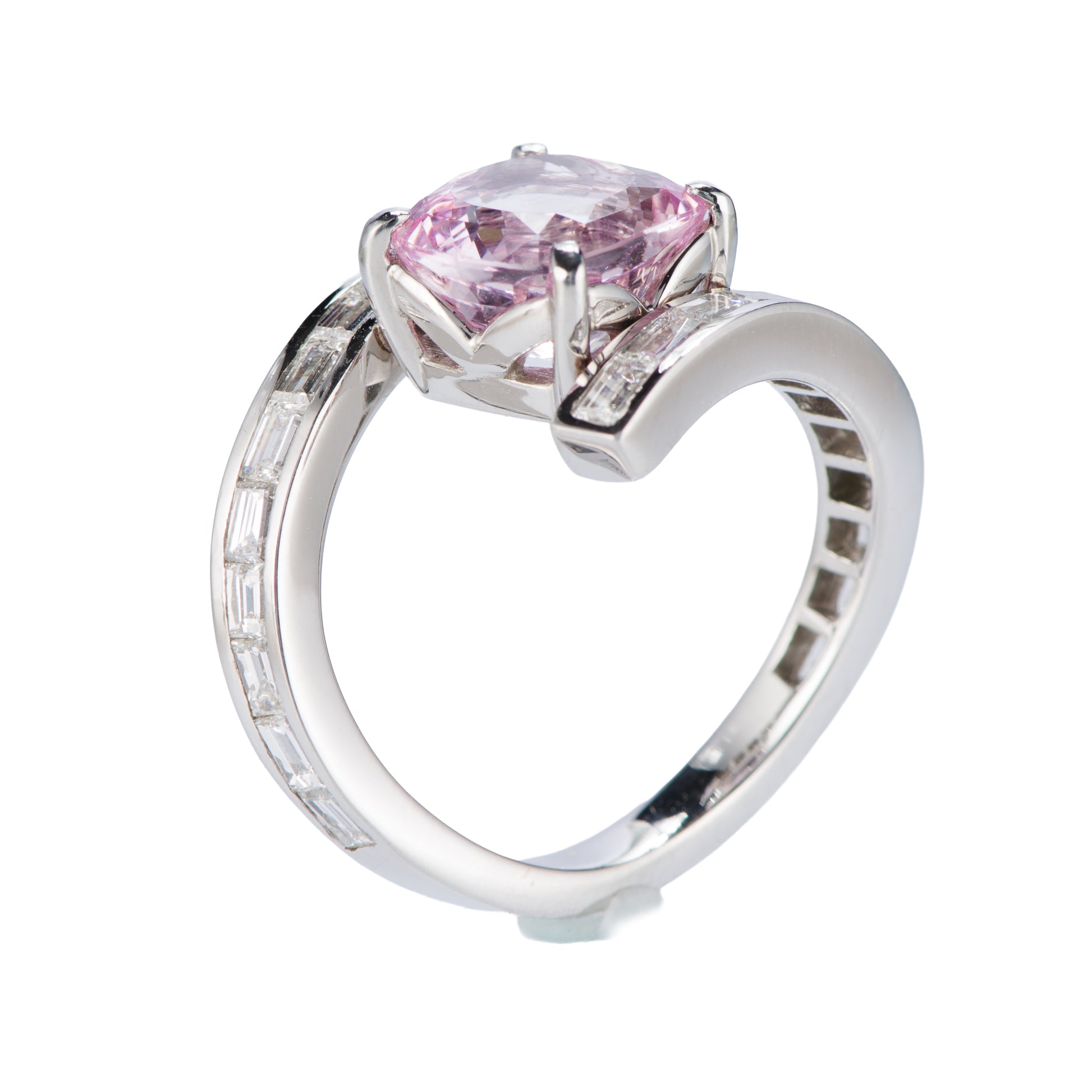 センターピンクサファイアをバケットカットがセットされた腕で挟み込むようにデザインされたリングは、エレガントなデザインになっています。