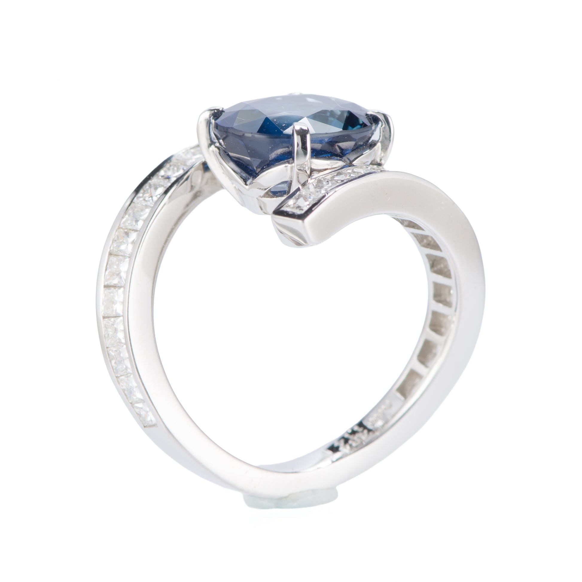 センターのブルーサファイアをプリンセスカットのダイヤモンドがセットされた腕で挟み込むようにデザインされたリングは、エレガントなデザインになっています。