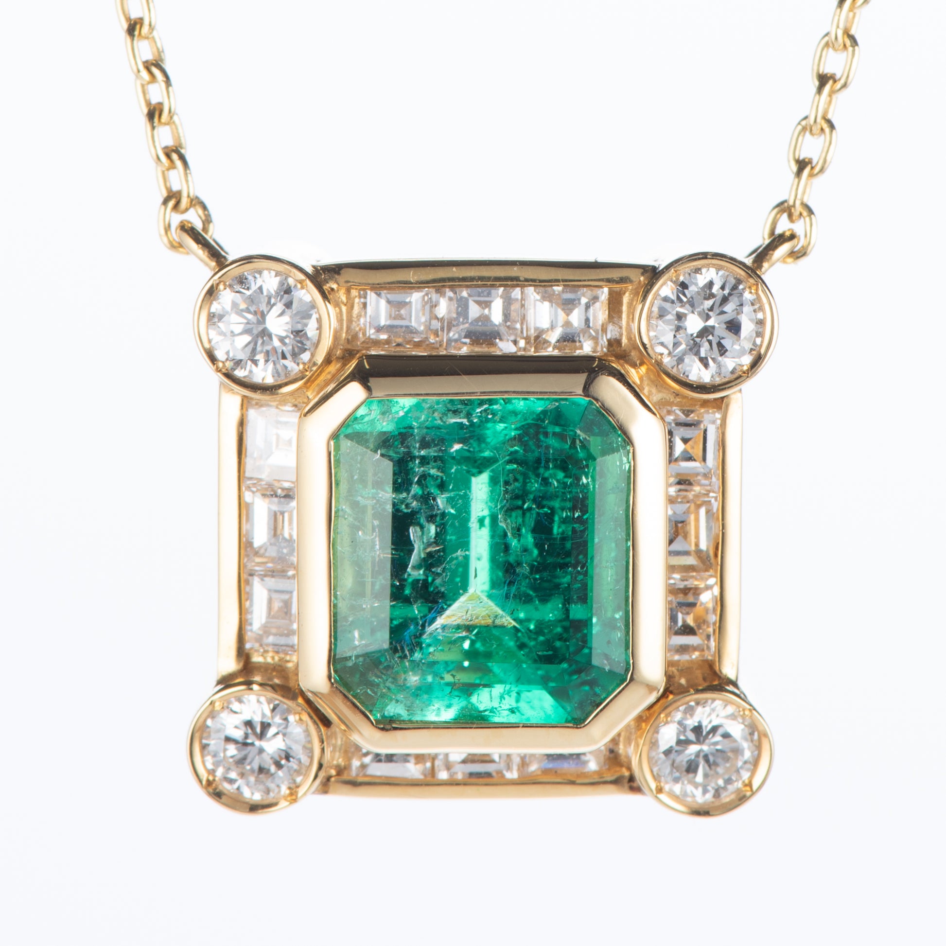 センターに透明感とクリアなハッキリとしたグリーンカラーのエメラルドをセッティングエメラルドに対してガードルを覆うように止めるセッティングは大変技術が問われるセッティングになります。エメラルド本来の色そのものを引き出すようにセッティング。透明感のあるエメラルドの魅力を引き立てるために周りに使用しているダイヤモンドはカレ(スクエアステップ)カットのダイヤモンドを使用し、全体にすっきりとしたデザインのペンダントになっております。