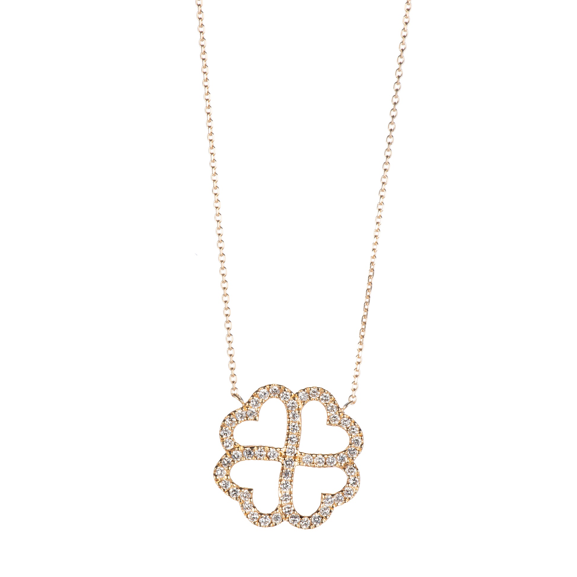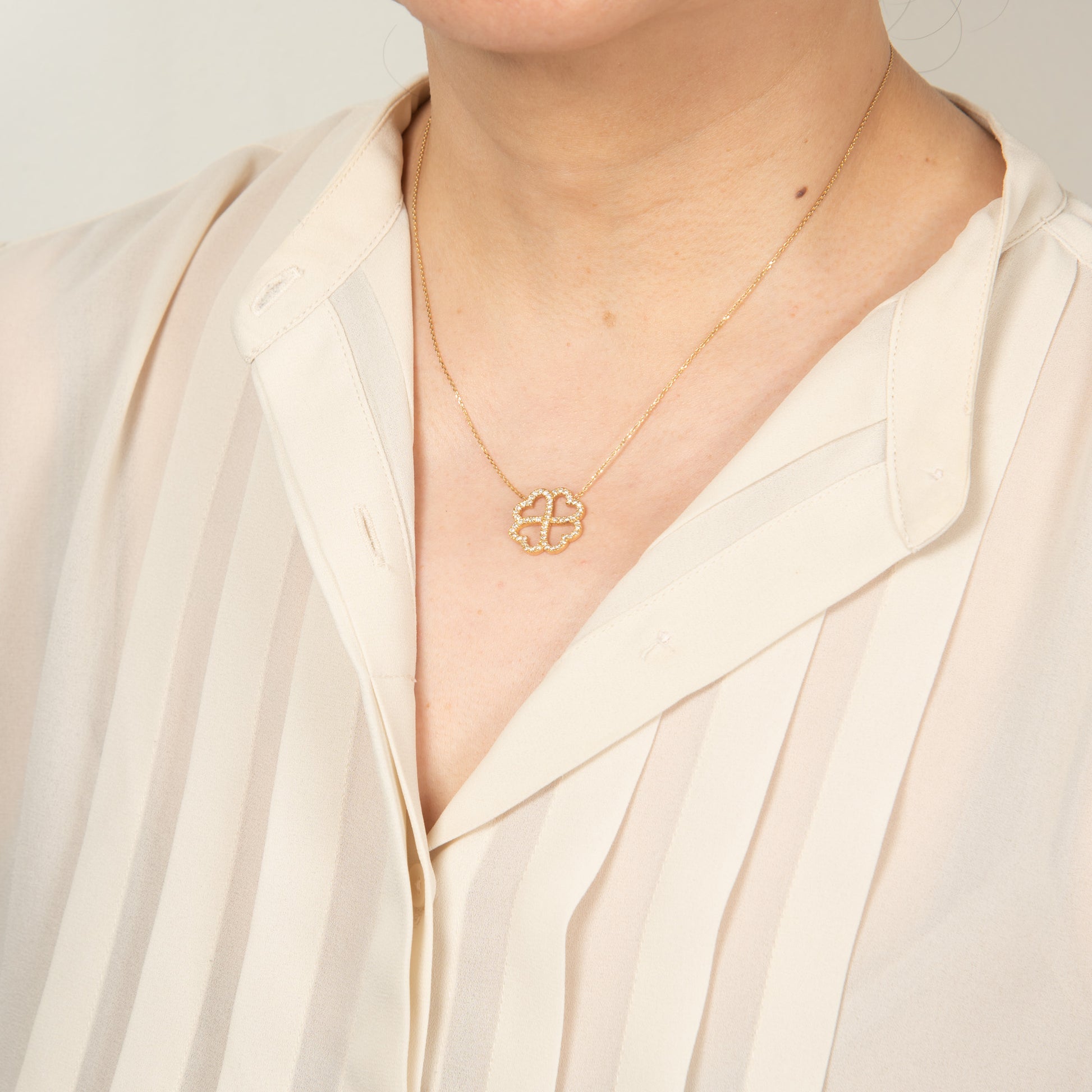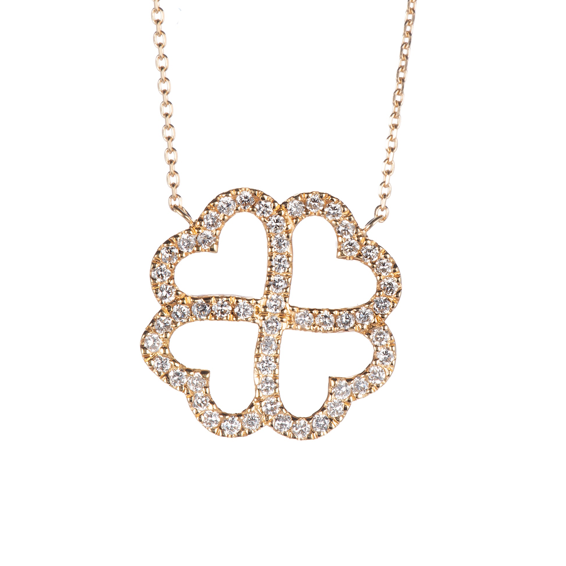 ハートを象った4枚の葉が寄り添うようにデザインされ、優しさと幸福を象徴するフォルムが胸元に上品な輝きを添えます。