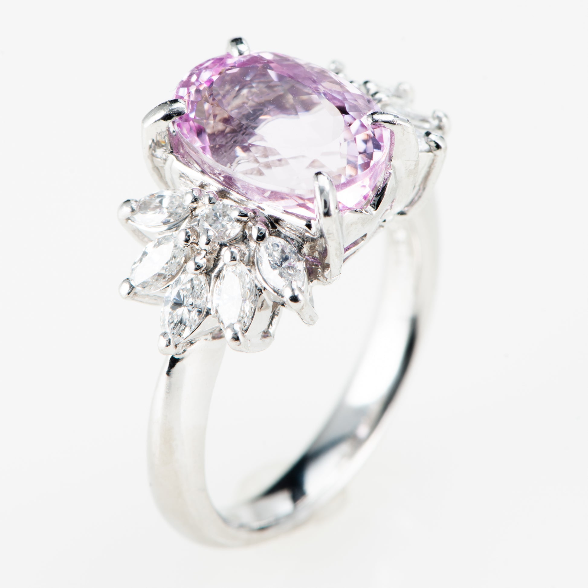 4.35ctの美しいピンクトパーズを使用したカクテルリング。両サイドにマーキスカットとラウンドのダイヤモンドをセットした華やかなリングです。シンプルなリングです。