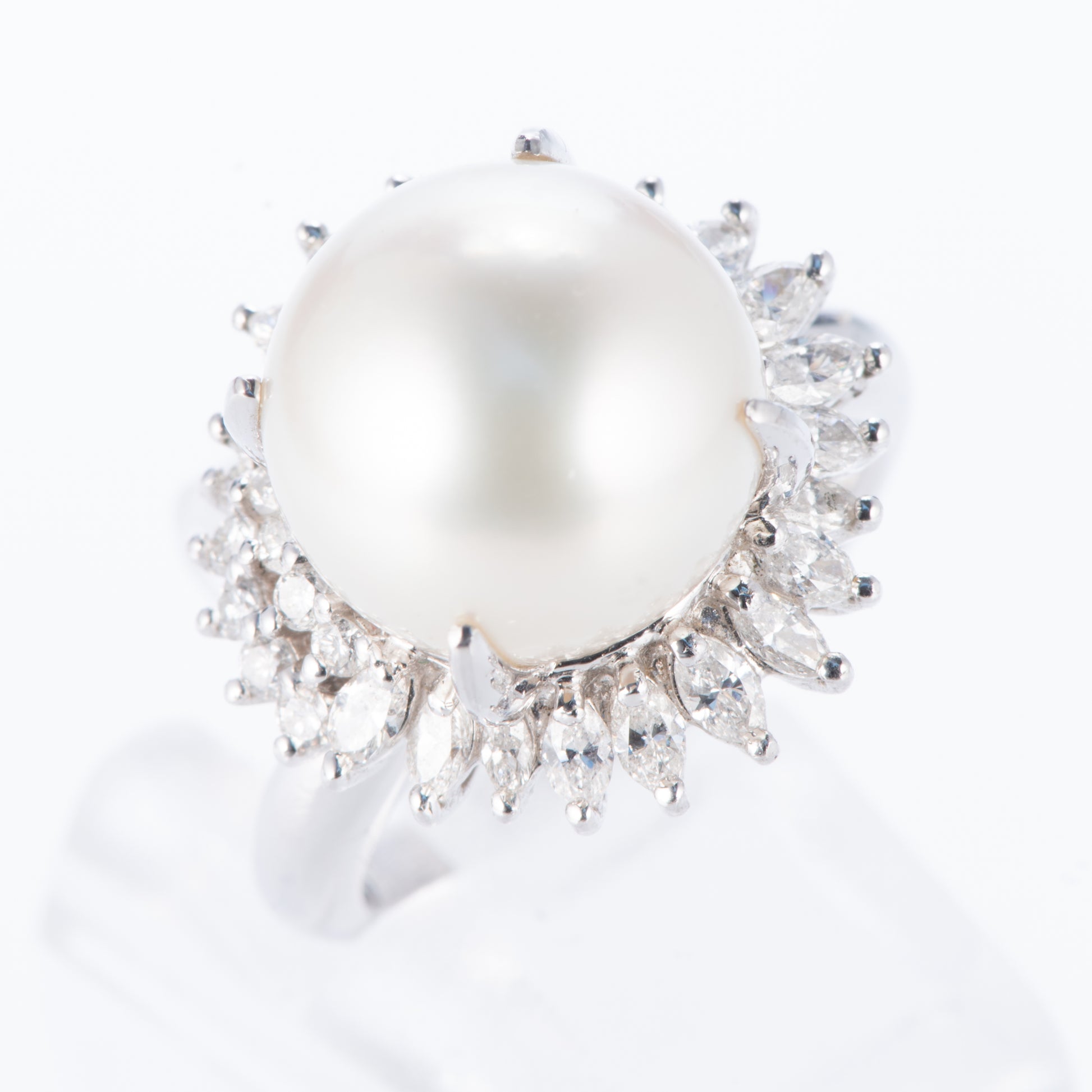 パールの周りをマーキス、ラウンドメレで取巻いたデザイン。エレガントにパールを纏い引き立ててくれます。