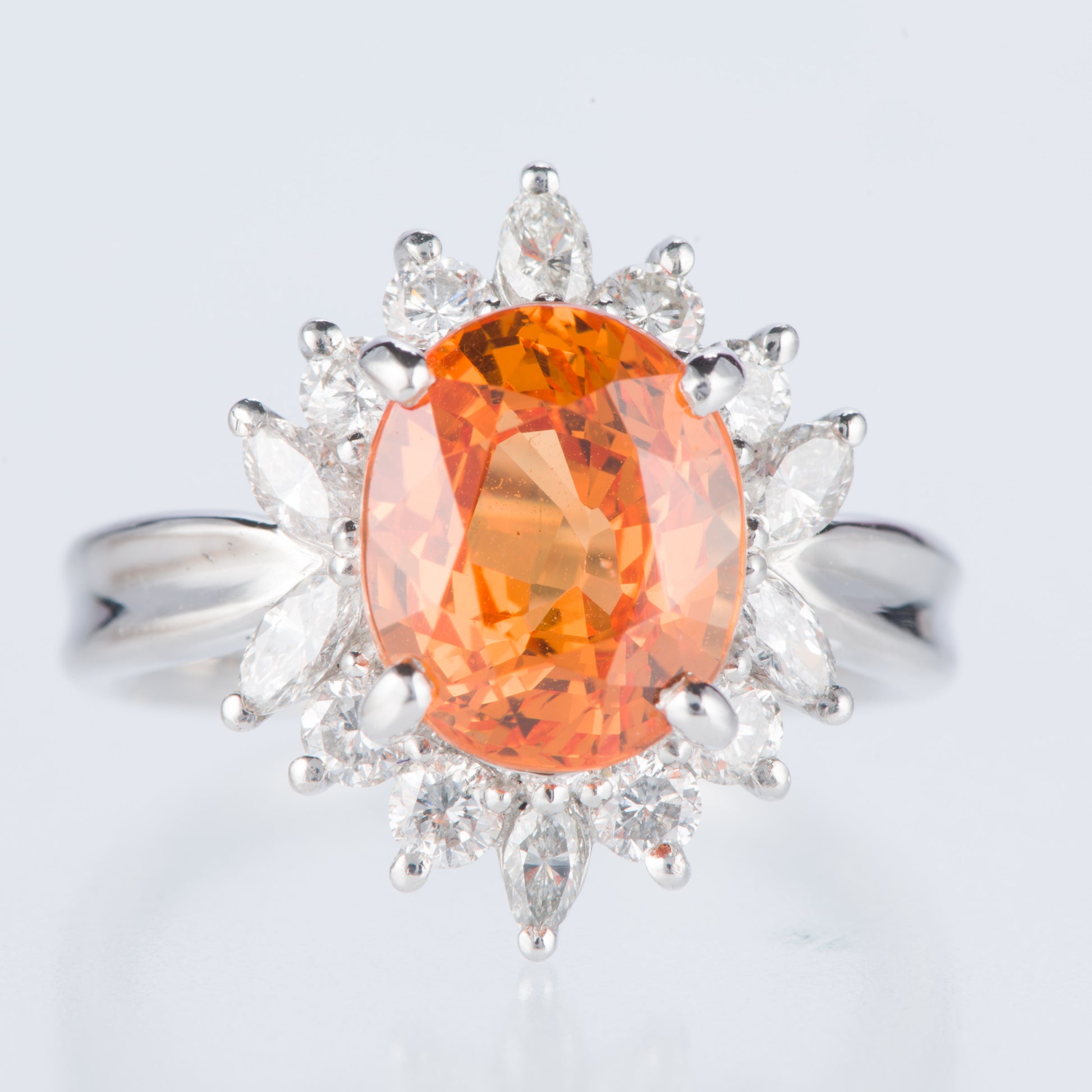 スリーストーン スぺサルティンガーネット x ダイヤモンド プラチナリング SG: 5.11 ct D: 0.86ct Pt900
