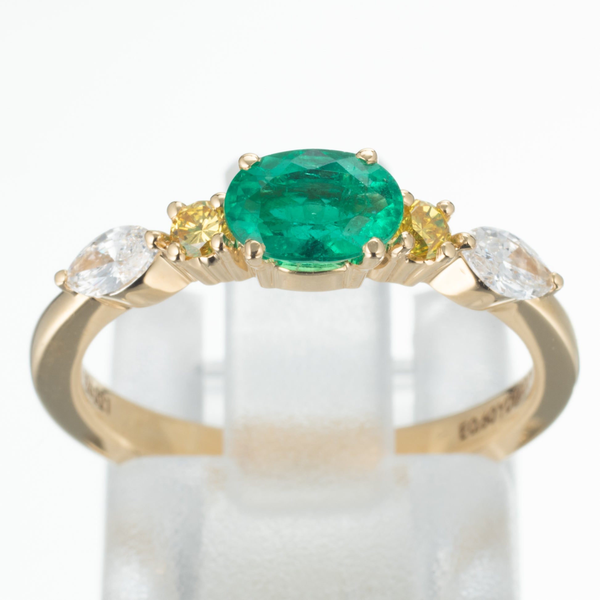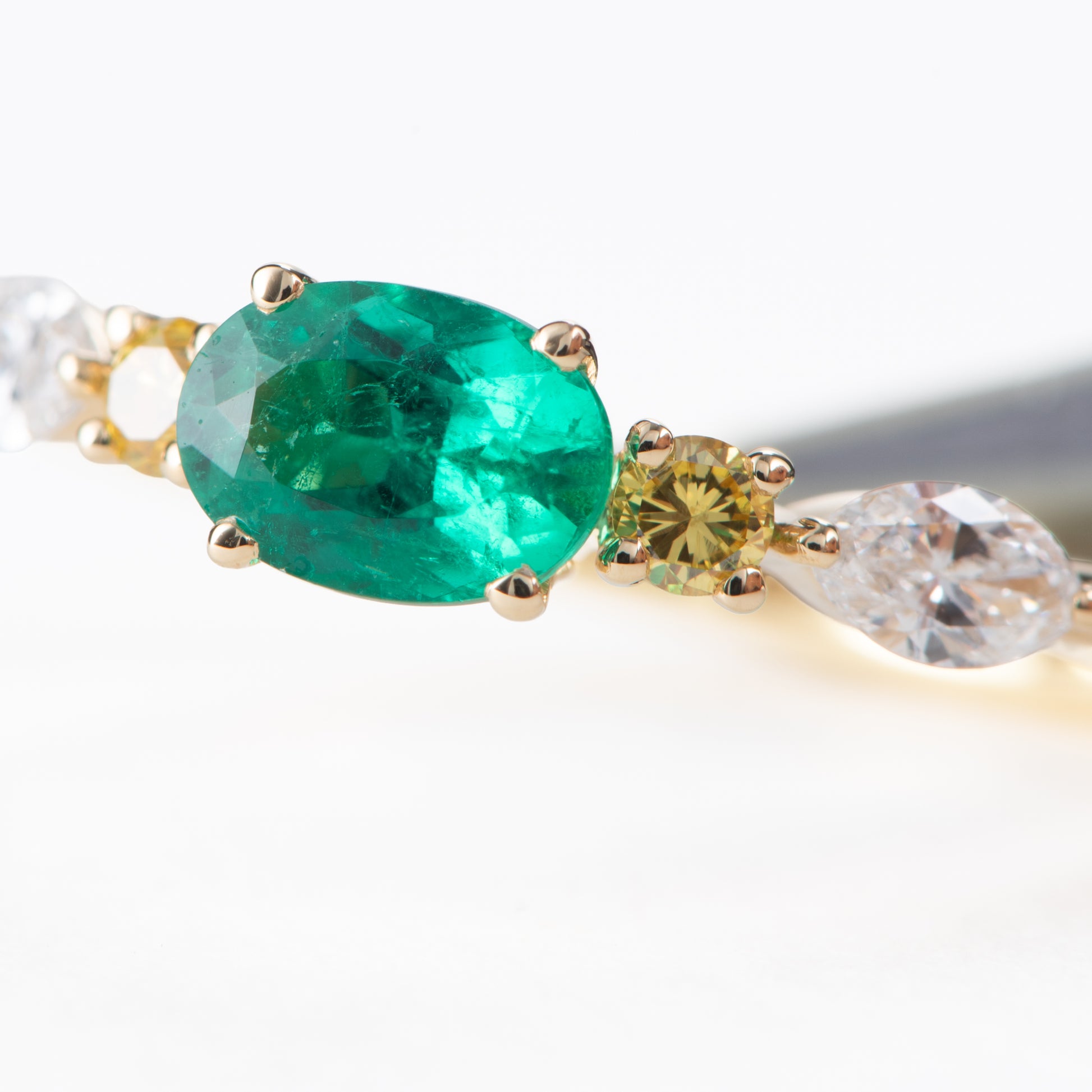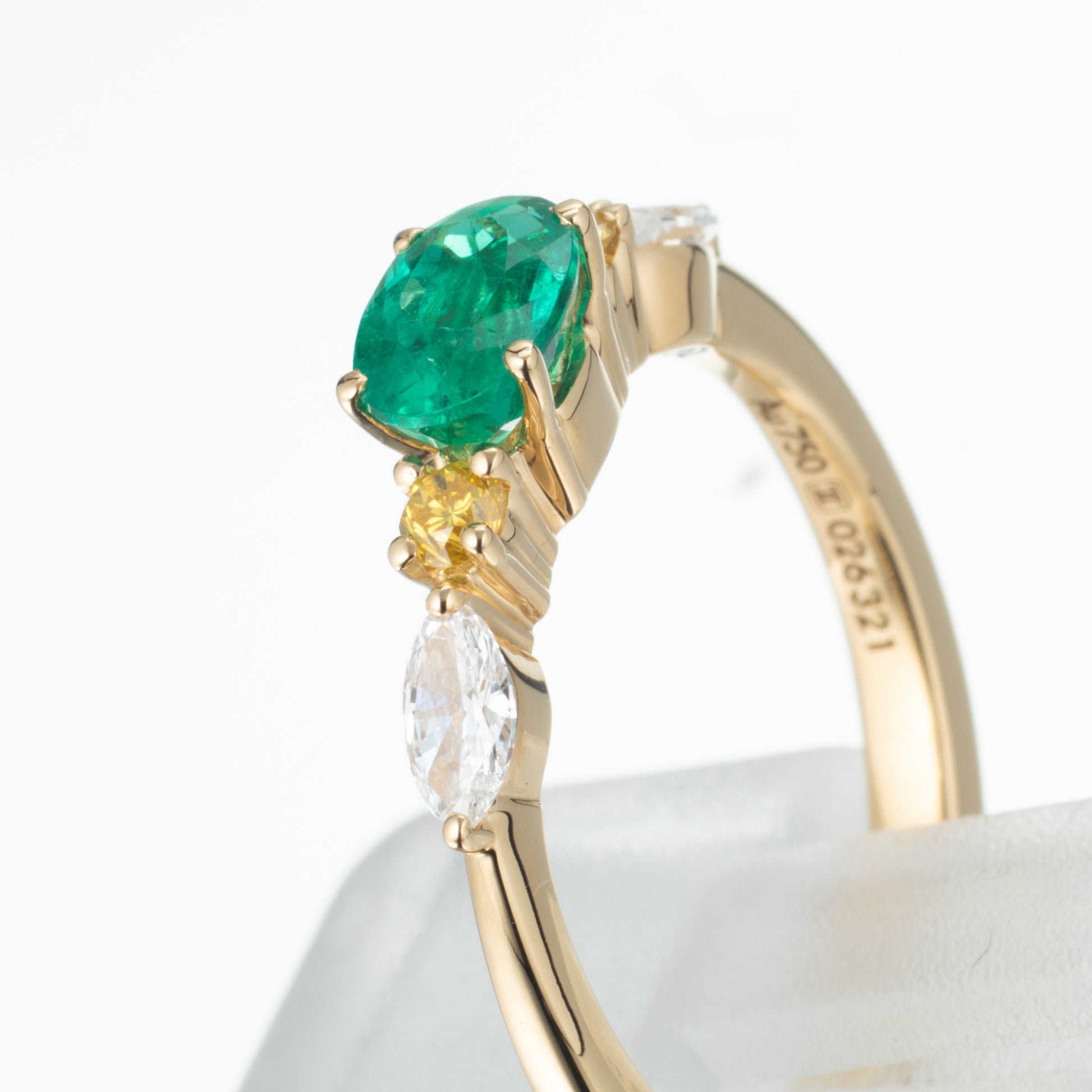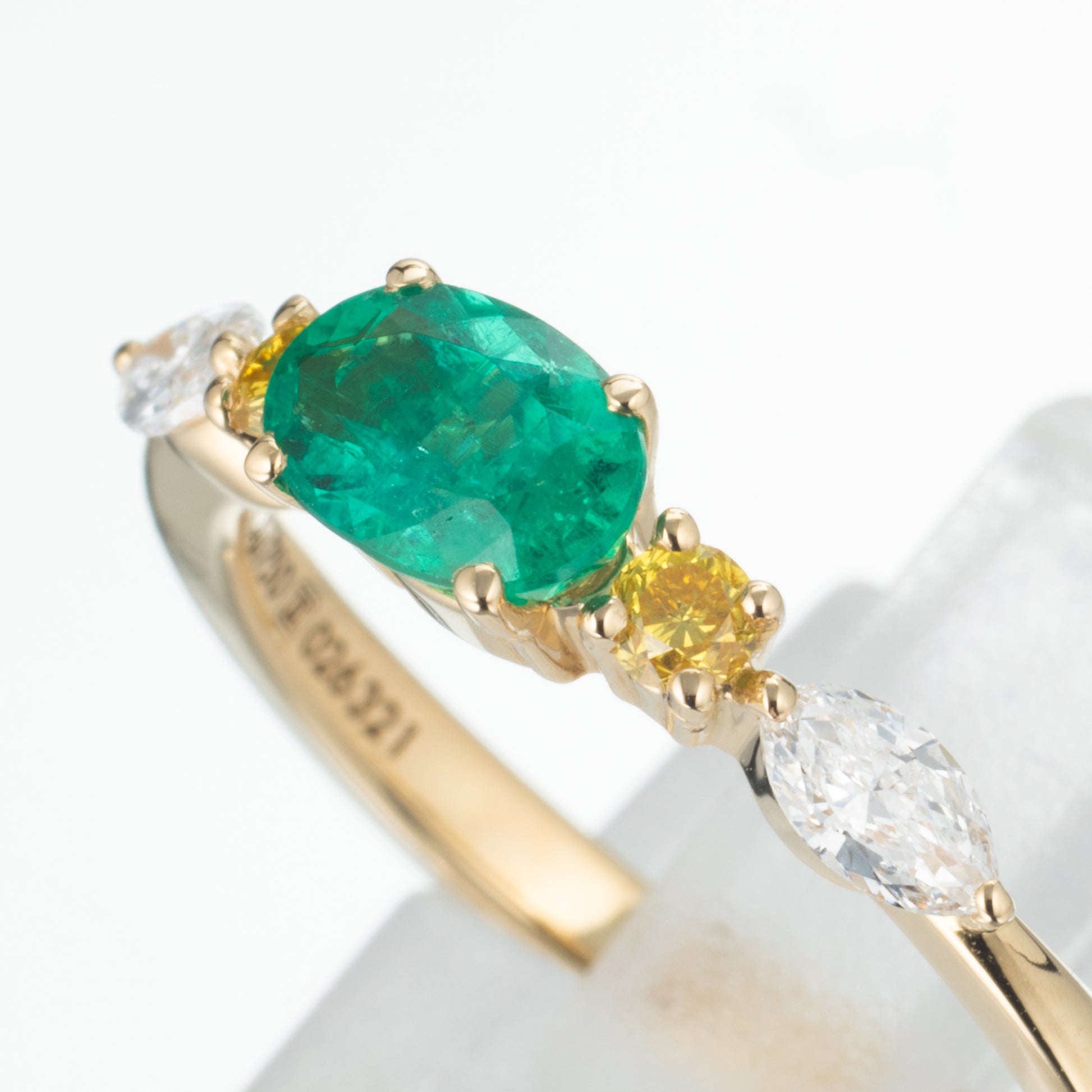 美しく透明感のあるグリーンが美しいコロンビア産エメラルドをセンターにセットし、両サイドにナチュラルのイエローダイヤ、マーキースシェイプのホワイトカラーのダイヤモンドをセットしたコントラストの美しい、リズミカルなリングになります。リングの素材はK18イエローゴールドでエメラルドとイエローダイヤの色と美しくマリアージュ。