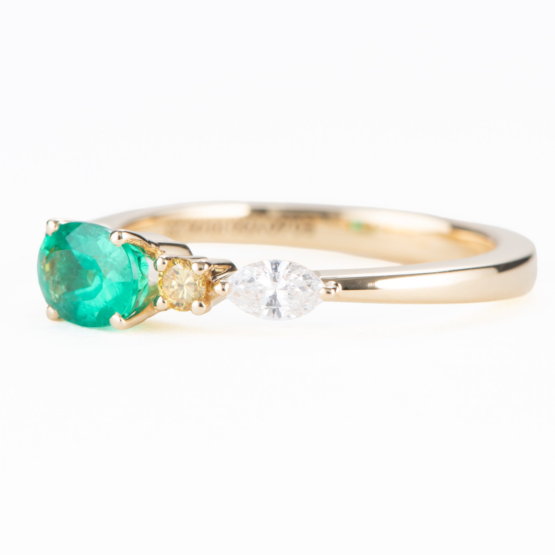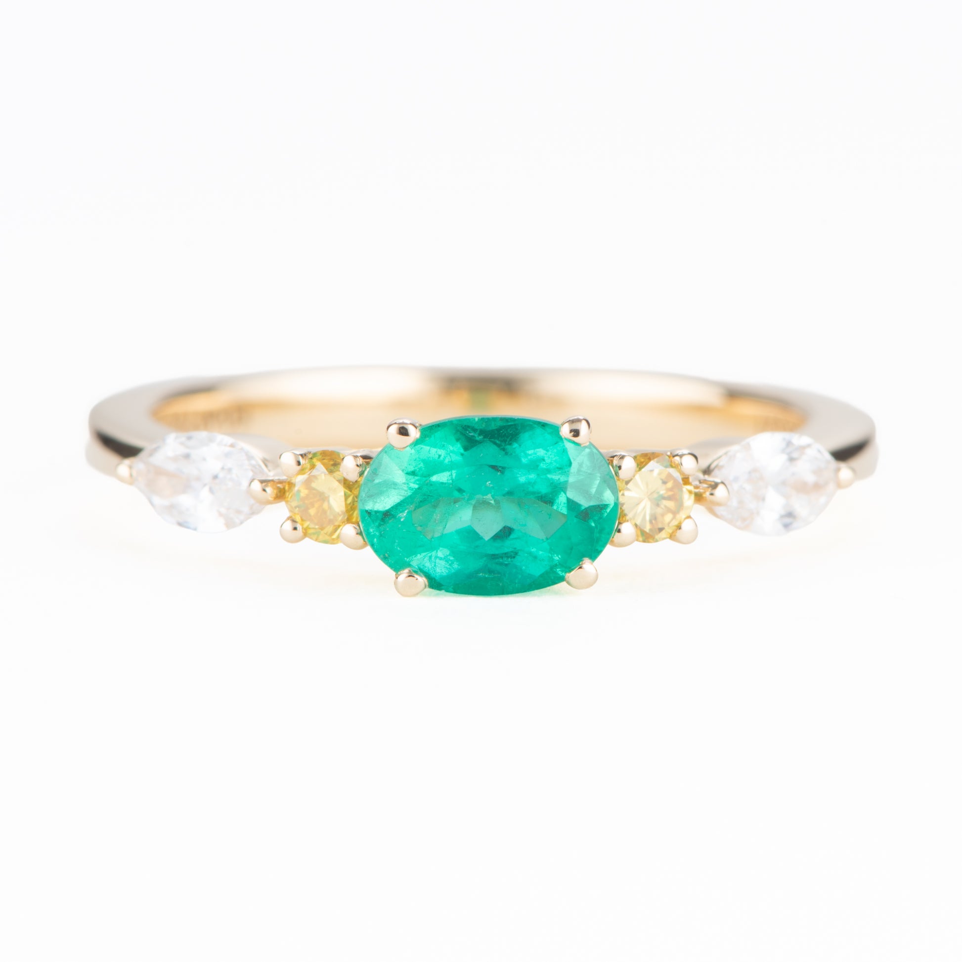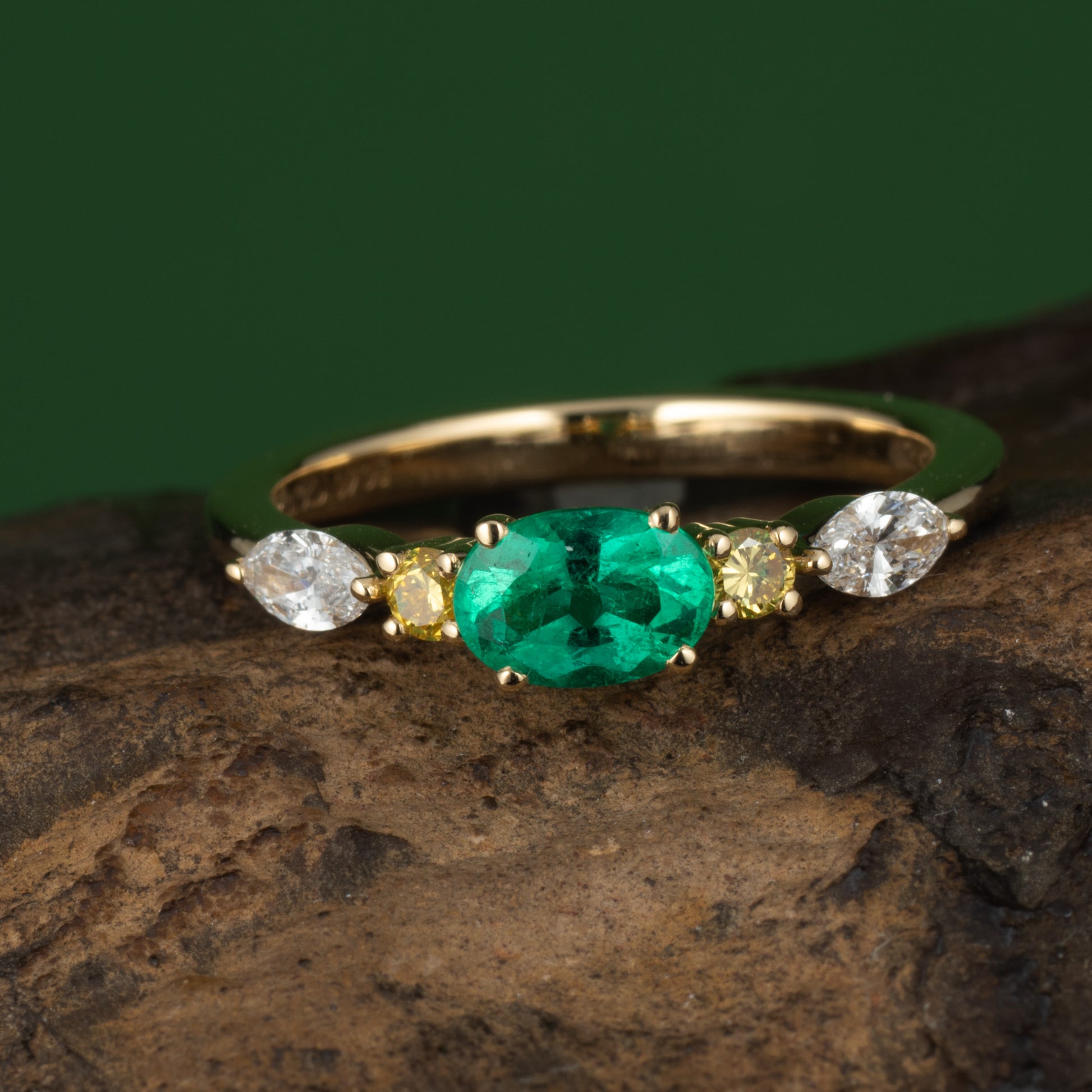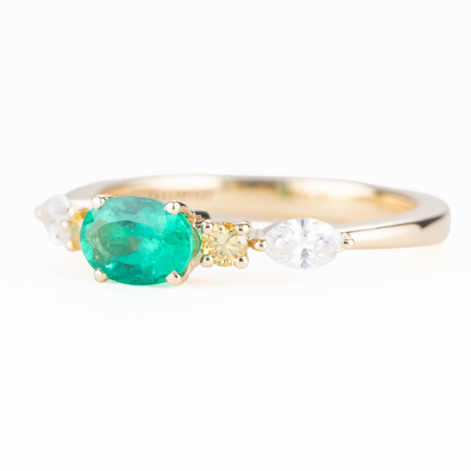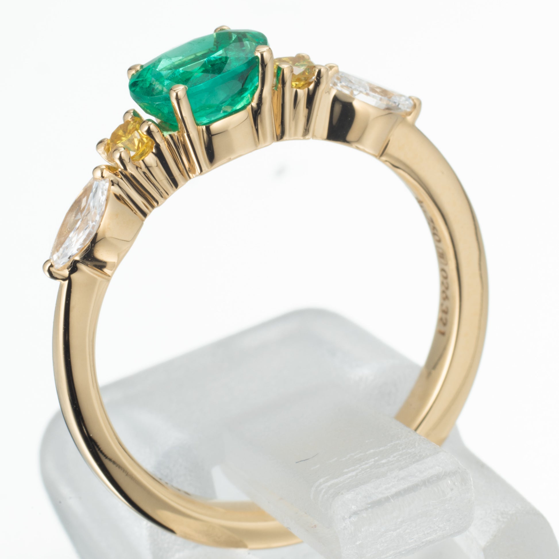 美しく透明感のあるグリーンが美しいコロンビア産エメラルドをセンターにセットし、両サイドにナチュラルのイエローダイヤ、マーキースシェイプのホワイトカラーのダイヤモンドをセットしたコントラストの美しい、リズミカルなリングになります。リングの素材はK18イエローゴールドでエメラルドとイエローダイヤの色と美しくマリアージュ。