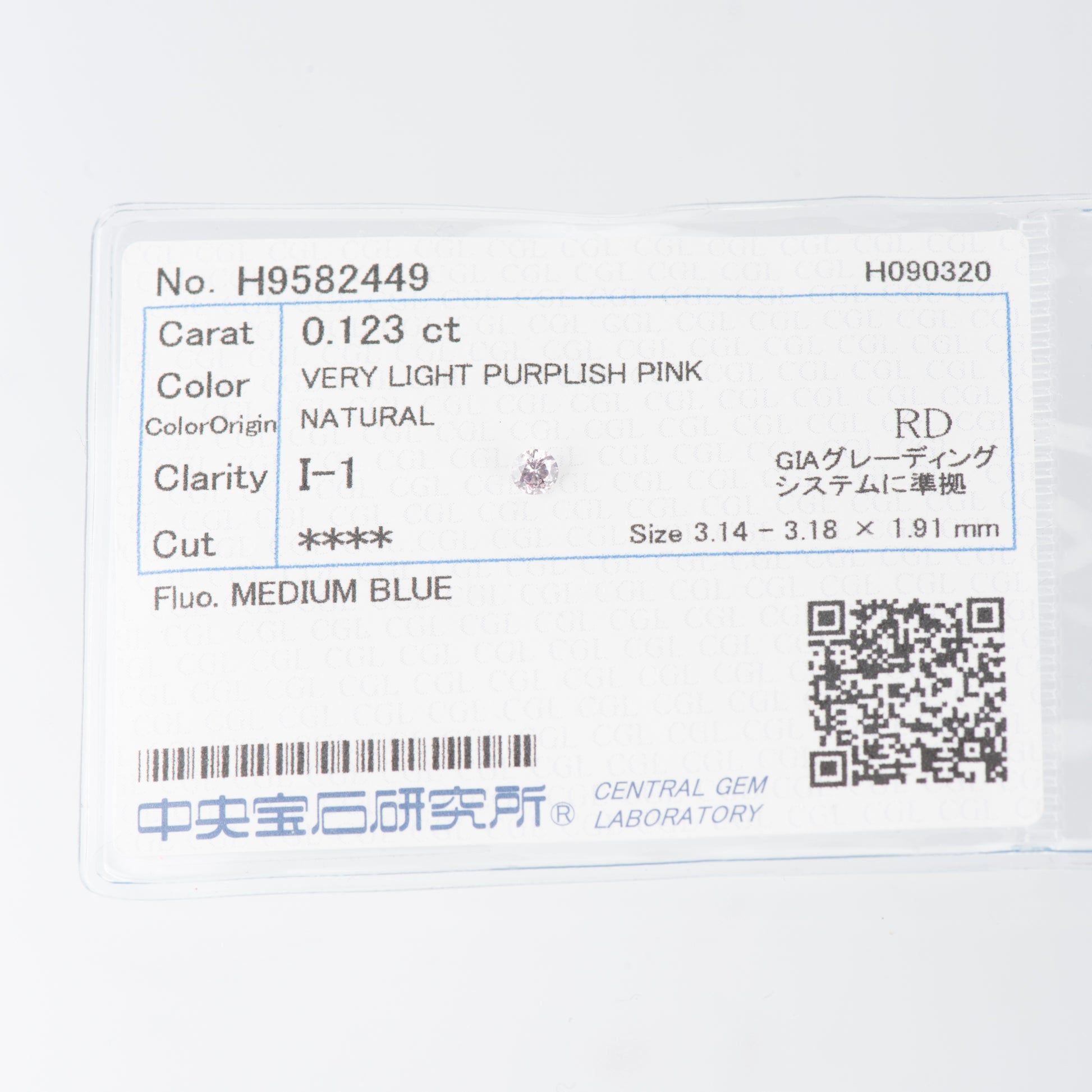 0.123ct, ベリーライトパープリッシュピンクダイヤモンド, I1, ラウンド, CGL, Very light purplish pink
