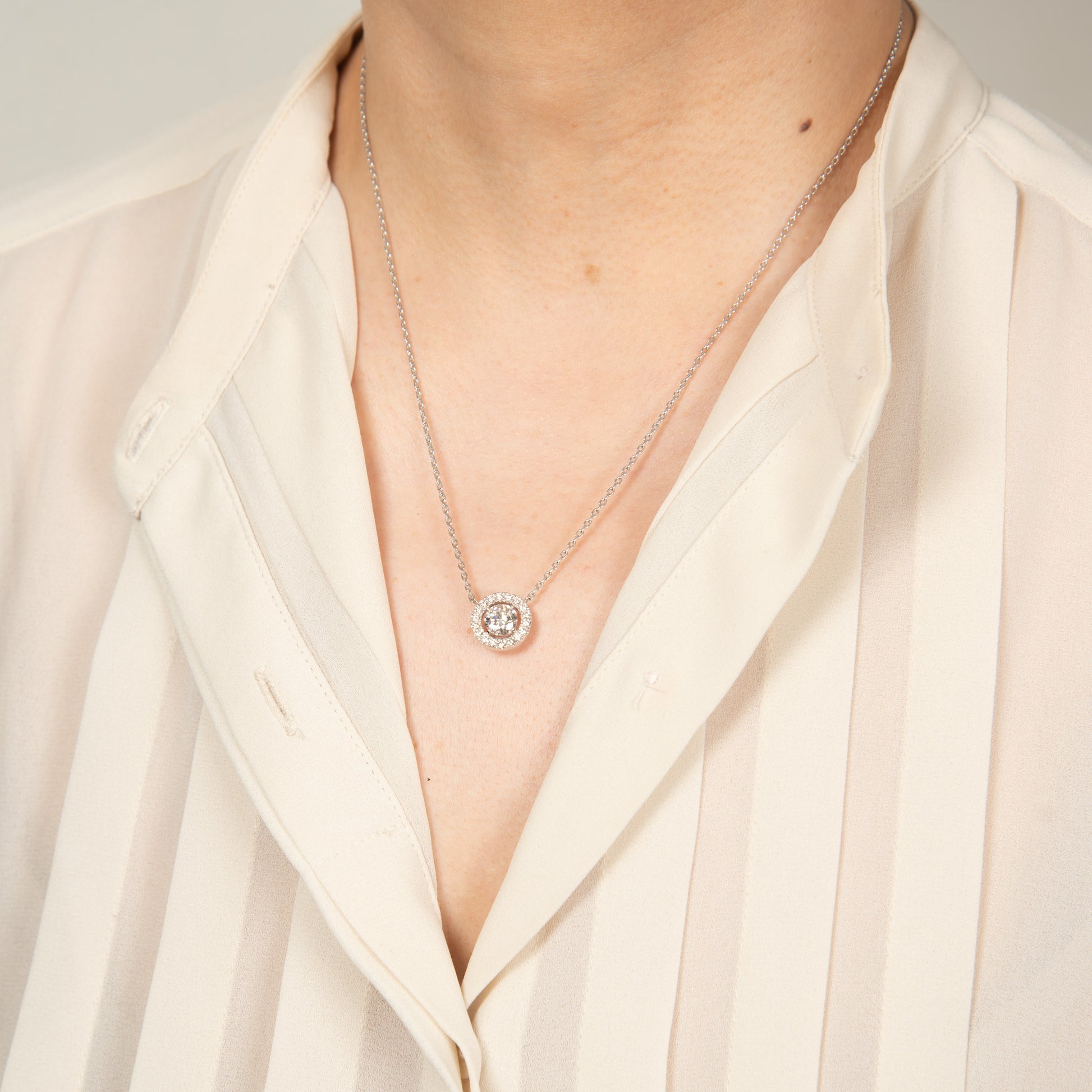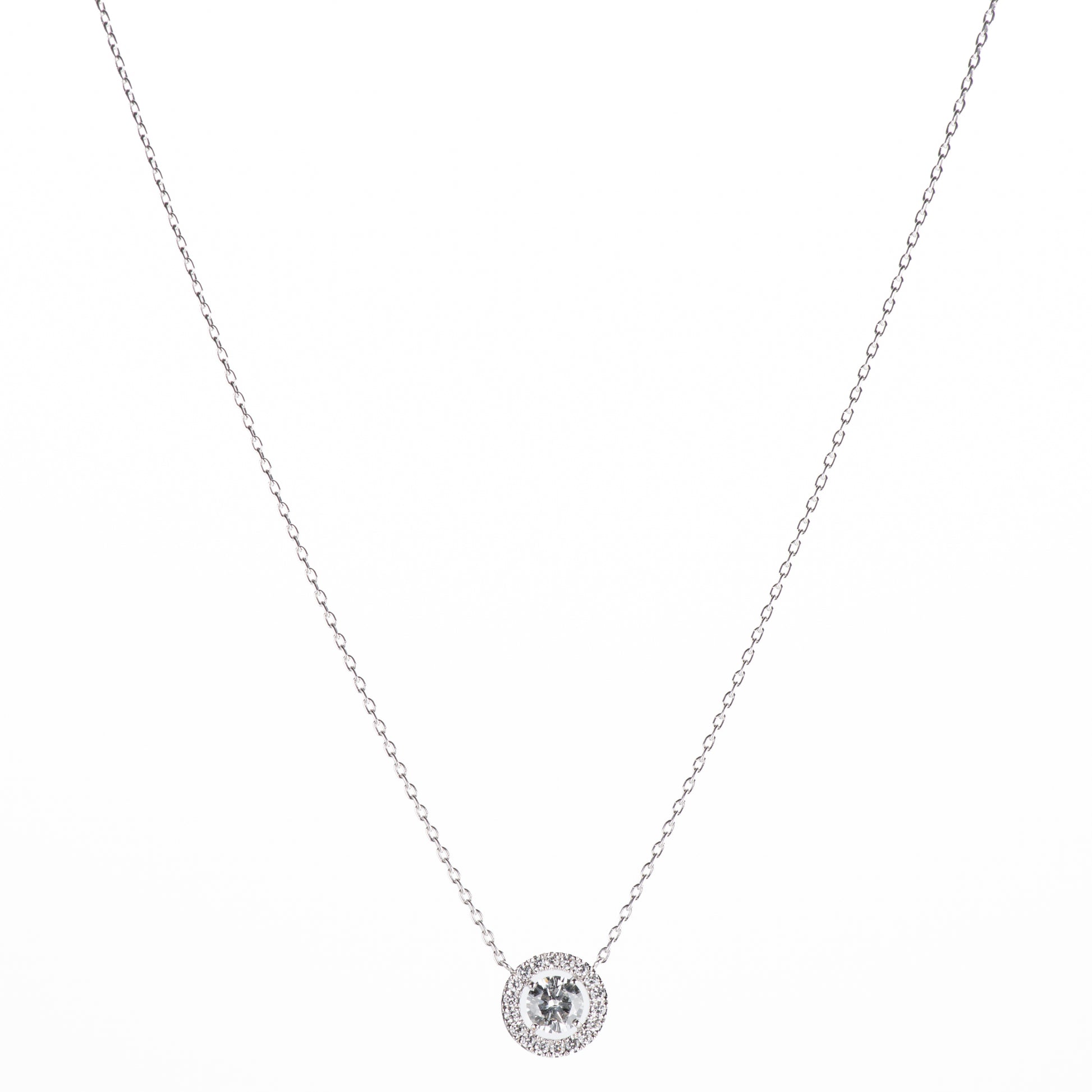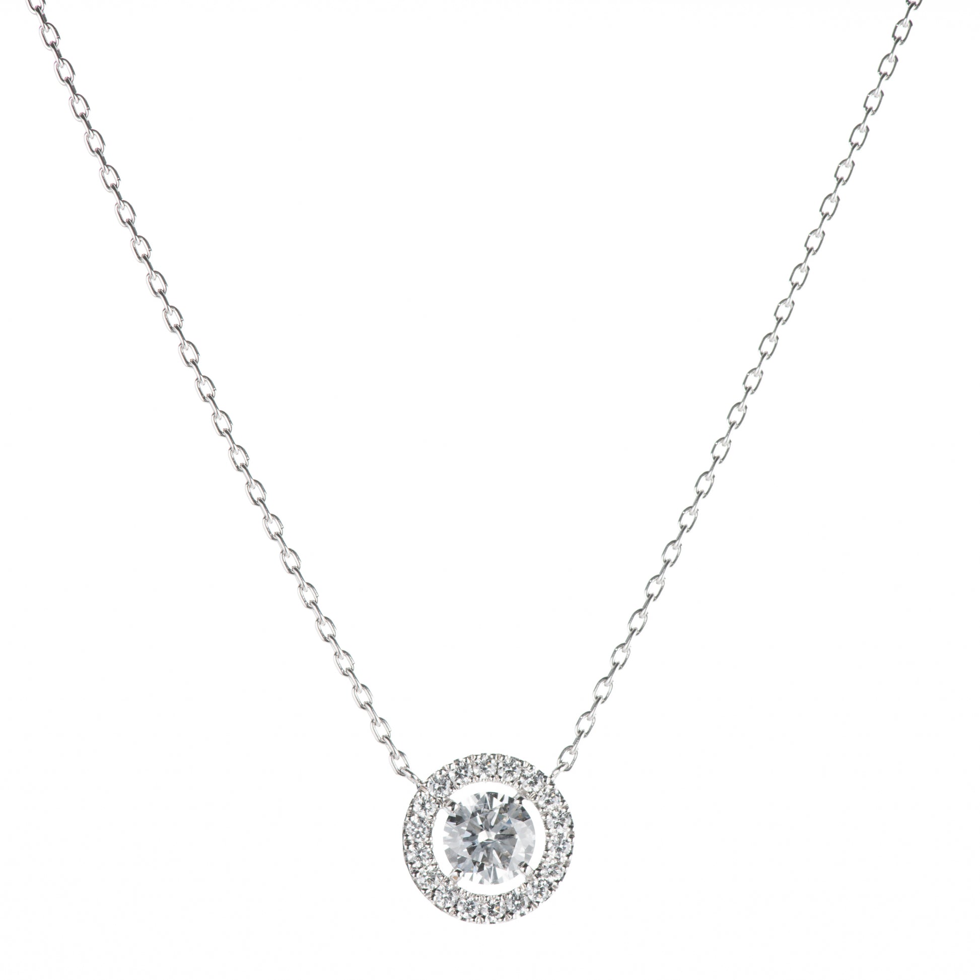 センター1ct, E SI2のダイヤモンドをセットし、少し空間を開けて周りに18ピース、合計0.31ctのダイヤモンドをセッティングしたハローペンダント。