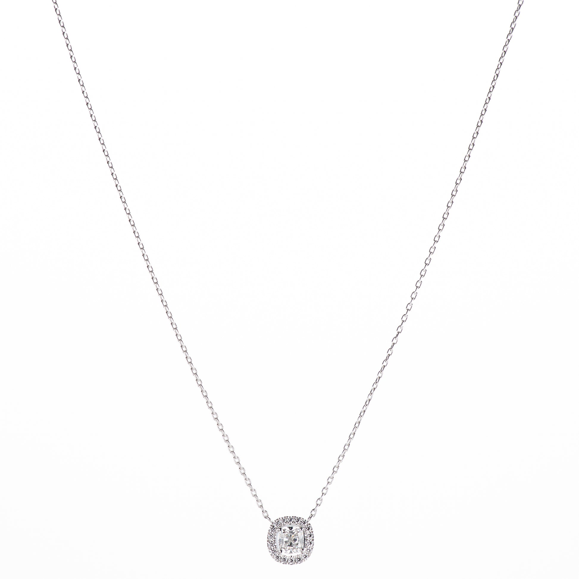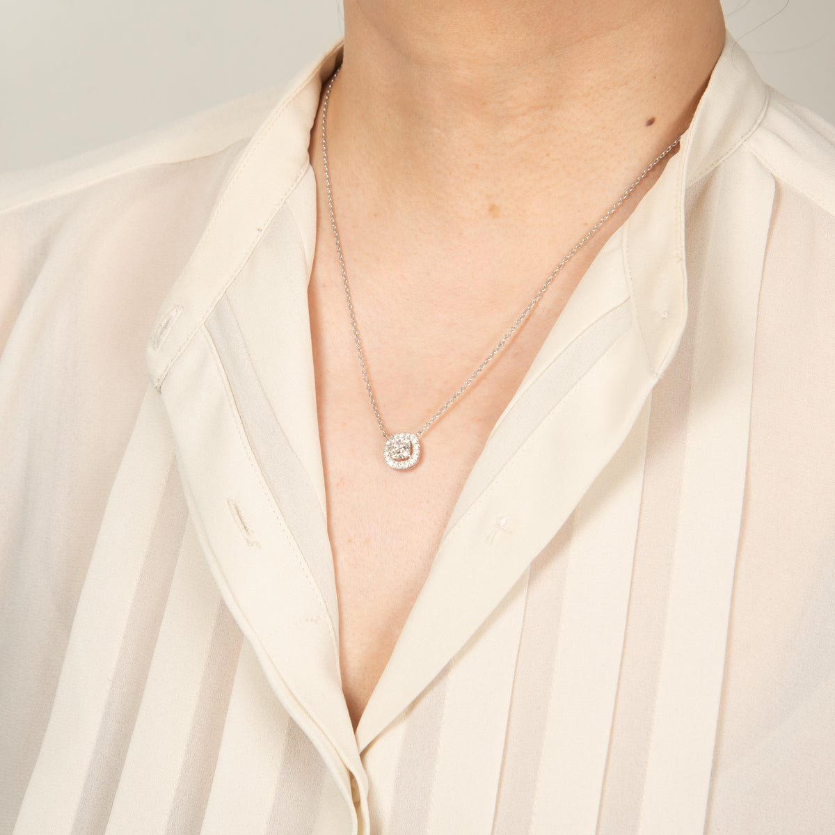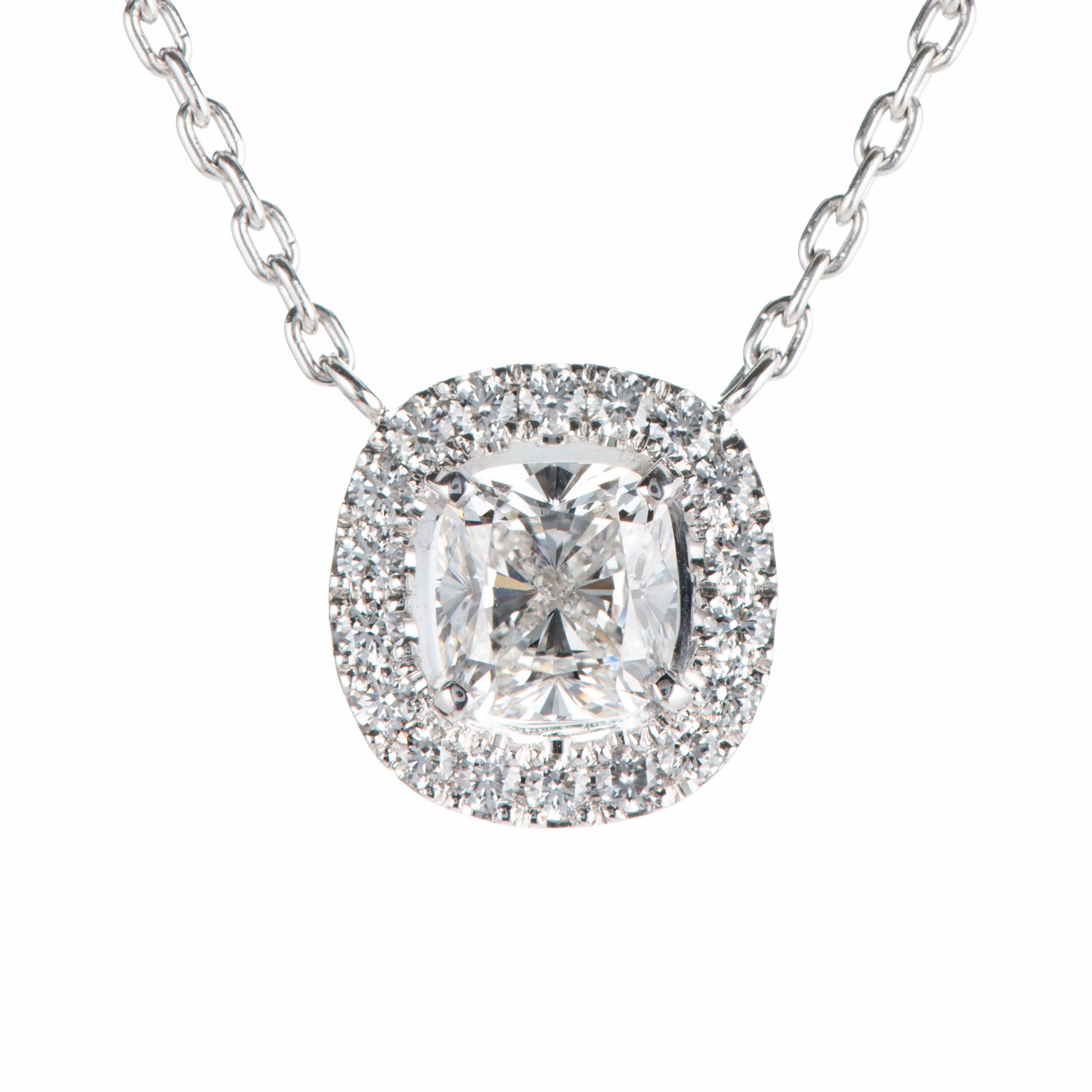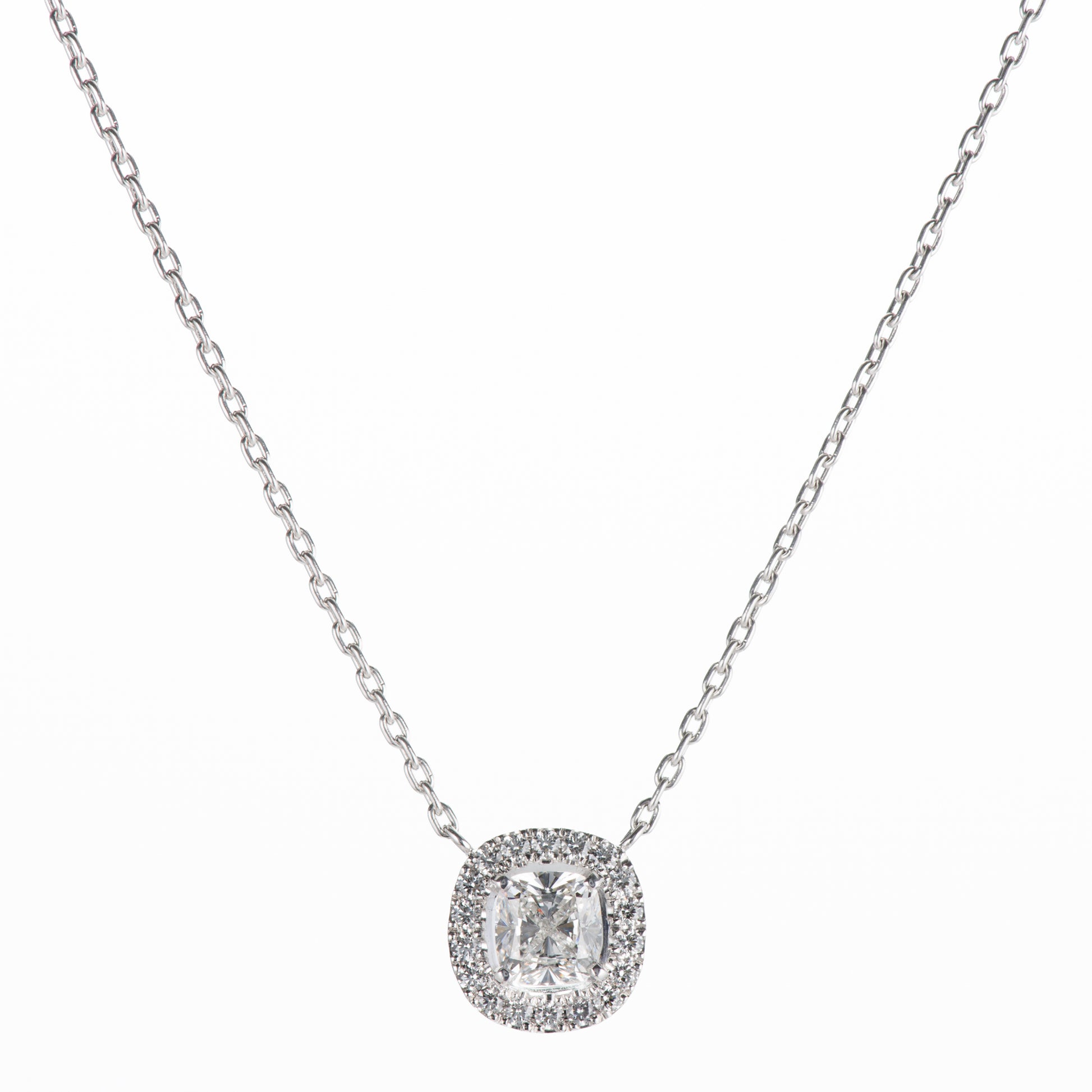 センターで輝く1ctのクッションカットのダイヤモンドの周りに、ハート&キューピッドのダイヤモンドで取り囲んだシンプルなペンダント。高品質なダイヤモンドをセンターに配置し、少し空間を開けて周りに18ピース、合計0.23ctのダイヤモンドをセッティング。どんな時間が経っても色あせることのないデザインです。