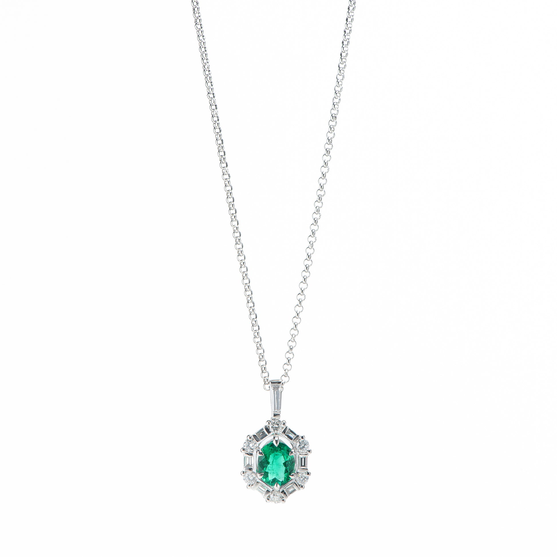こちらのペンダントはセンターのエメラルドをバケットカットとラウンドブリリアントカットで取り巻いておりますので、バケットカットの落ち着いた輝きがエメラルドを上品に引き立てています。