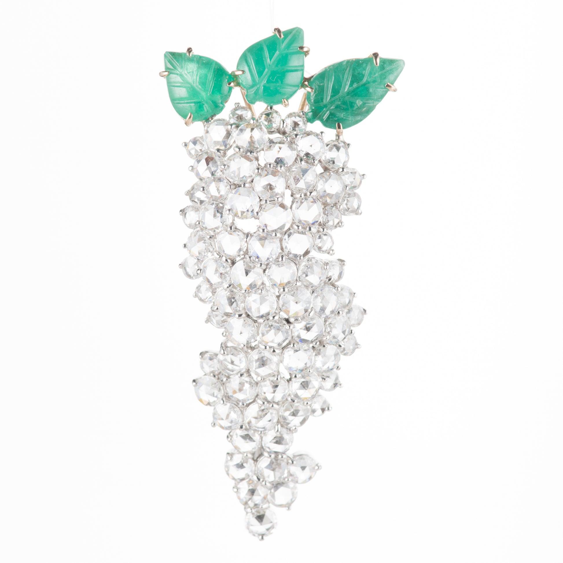 ローズカットのダイヤモンドとカービングエメラルドを使ったグレープ(葡萄)のデザインのブローチになります。