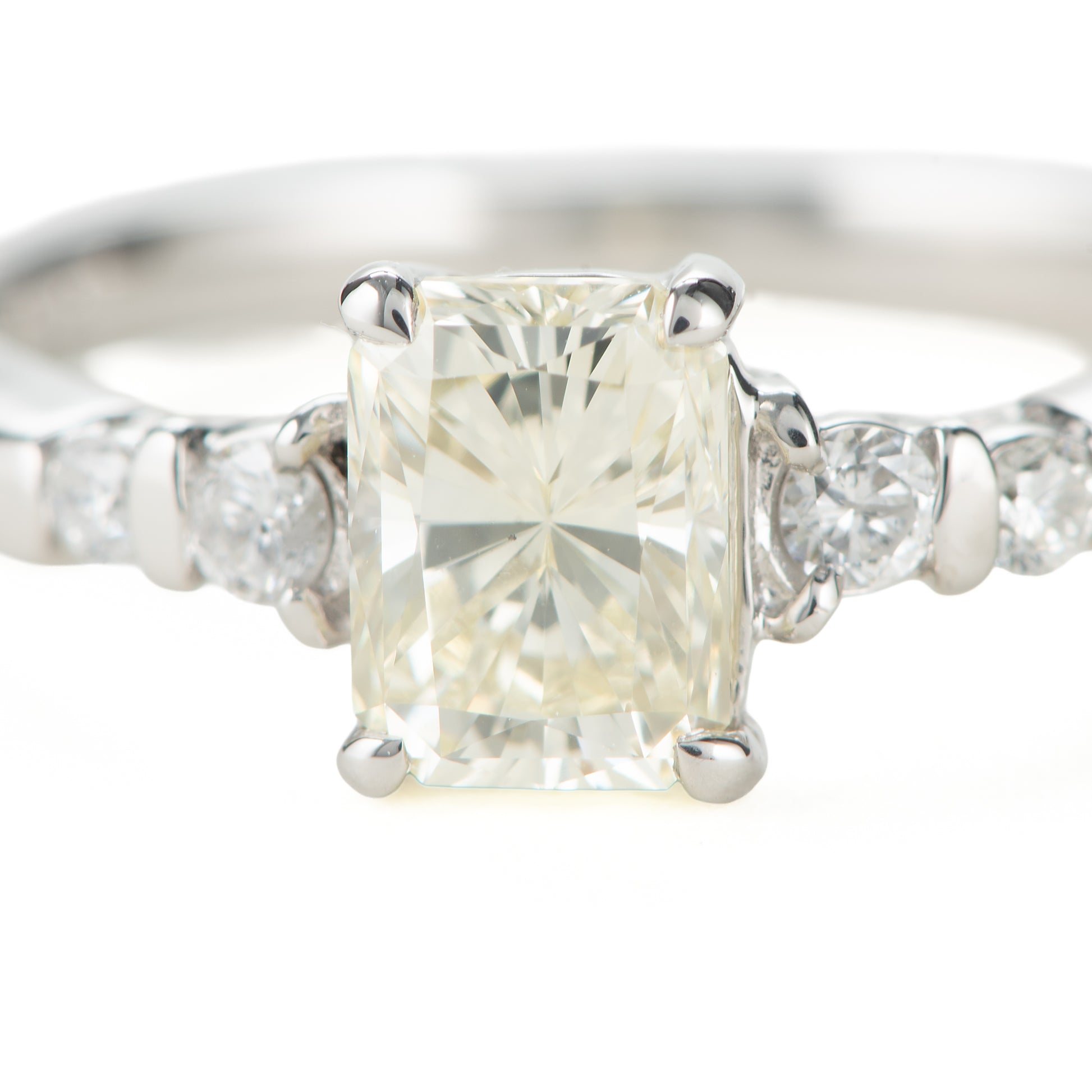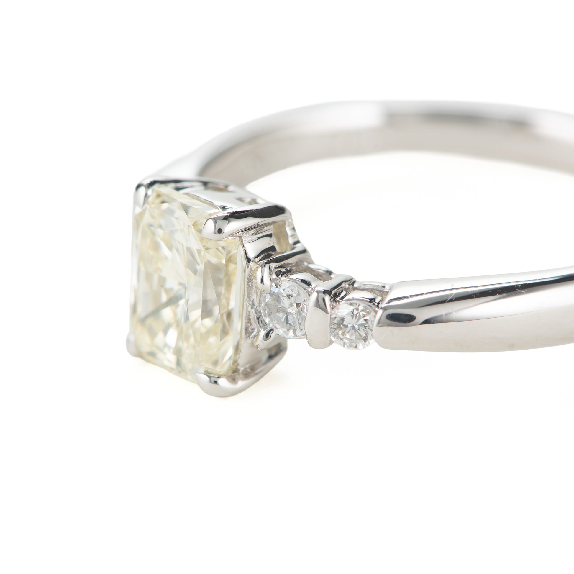 センターにラディアンカットのライトイエローダイヤモンドをセットしたプラチナ製のリングになります。