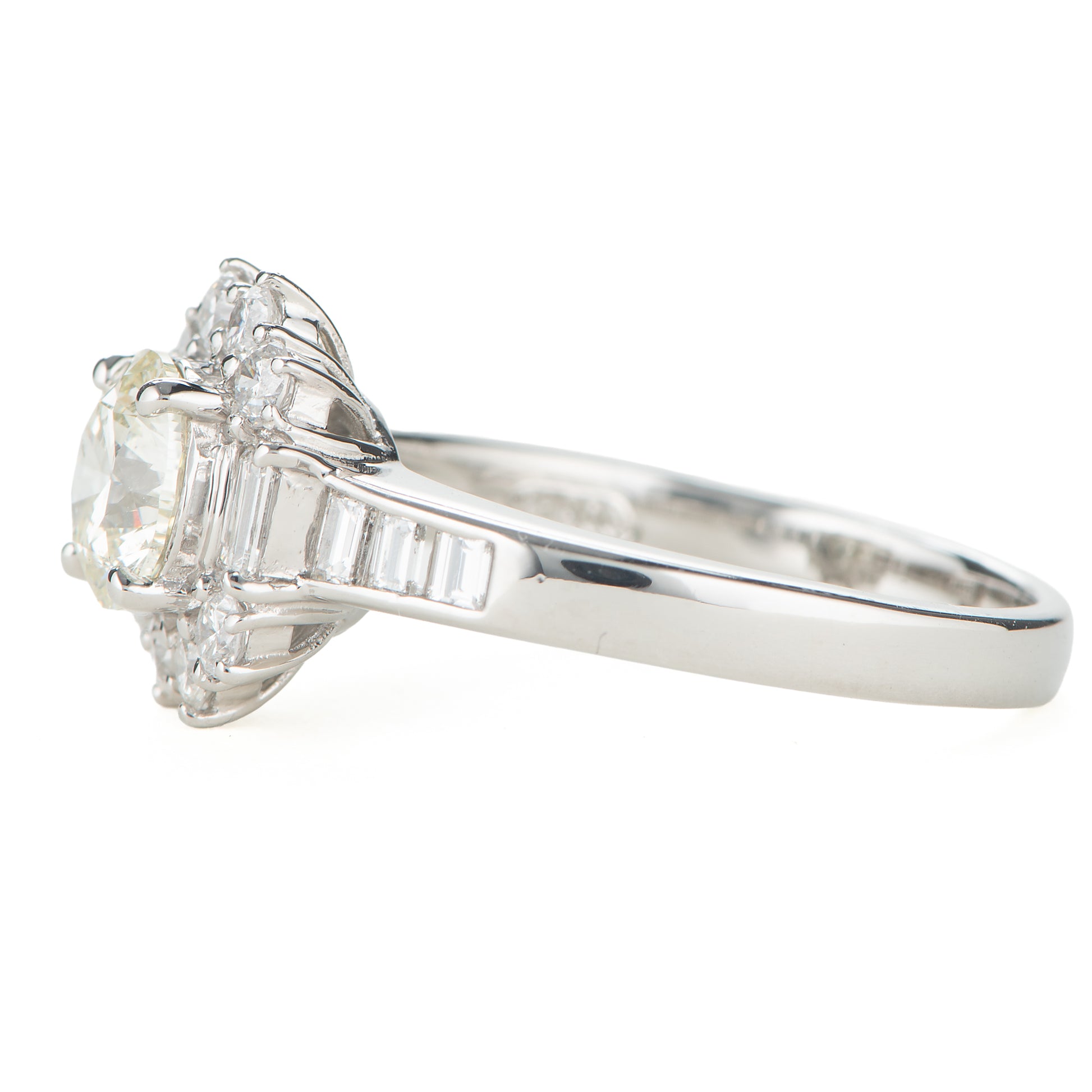 周りにはダイヤモンドメレと腕部分にバケットカットダイヤモンドをセットし華やかなデザインのリングとなっています。カラーはMカラー、クラリティはSI2クラス。サイドから見れば僅かにMカラーは確認できますが、フェイスアップで見たときにはそこまでの色味は感じられないダイヤモンドになっています。