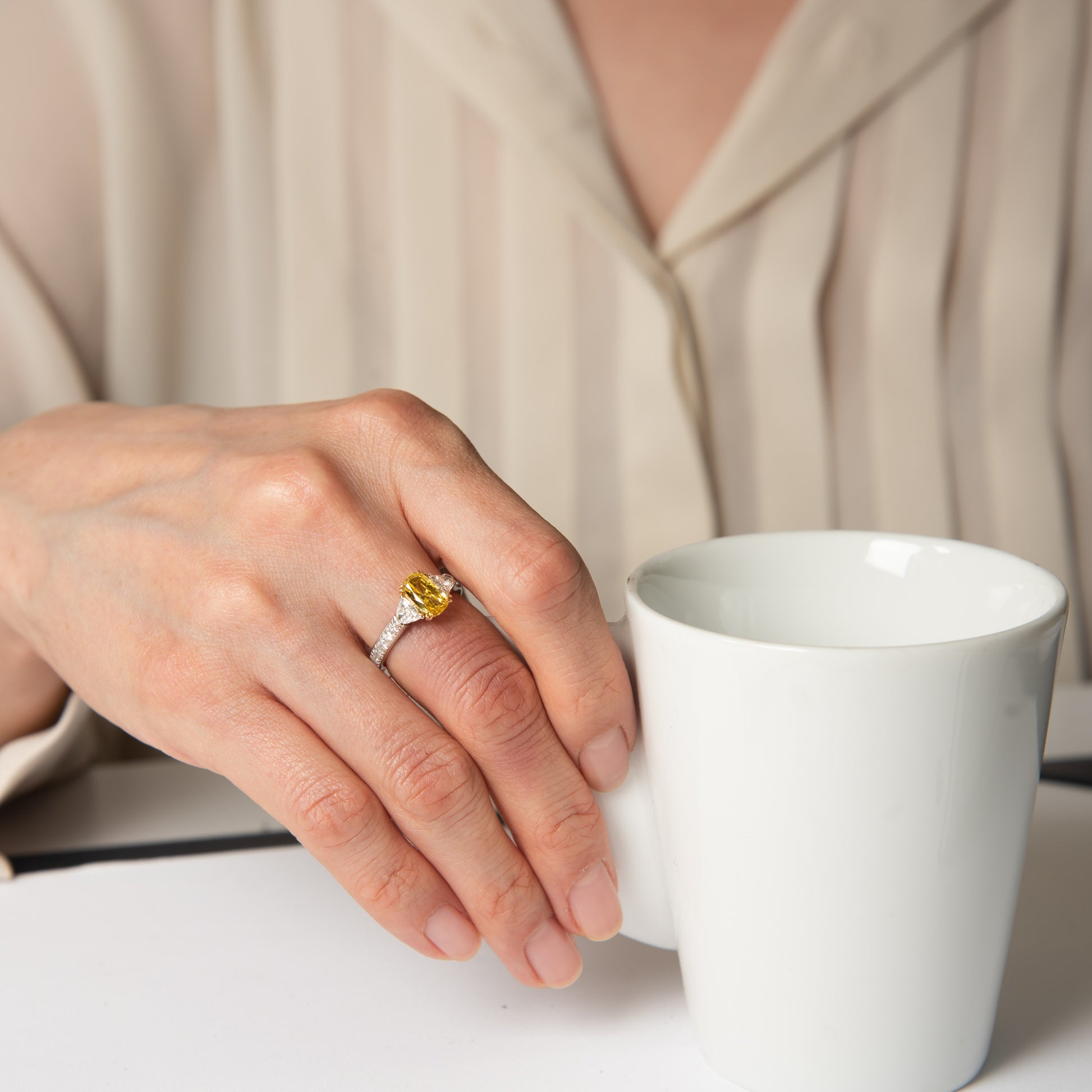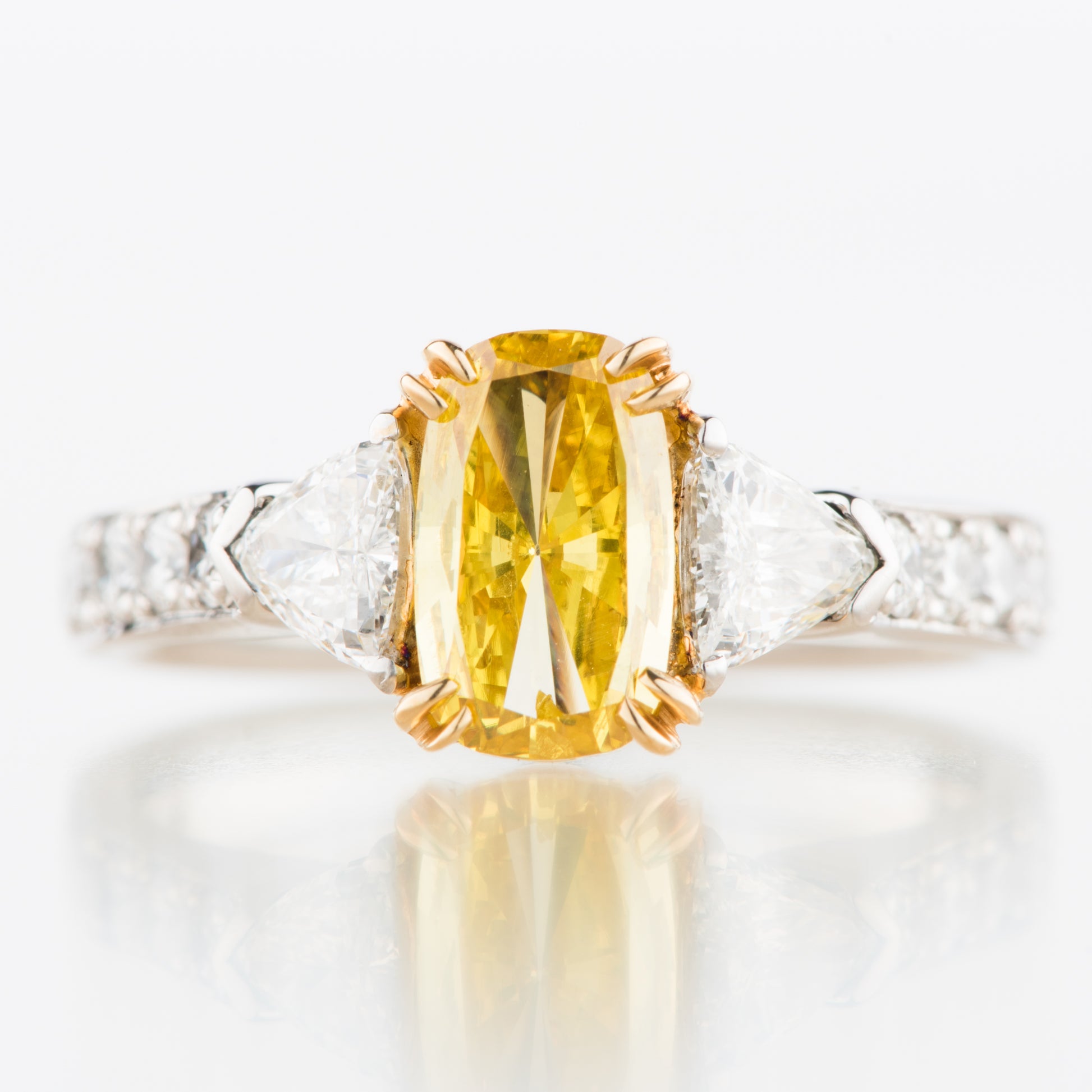 センターのイエローダイヤモンドの脇にトリリアントカット、腕にはメレをセッティング。センターのイエローダイヤモンドを繊細な輝きで引き立ててくれます。