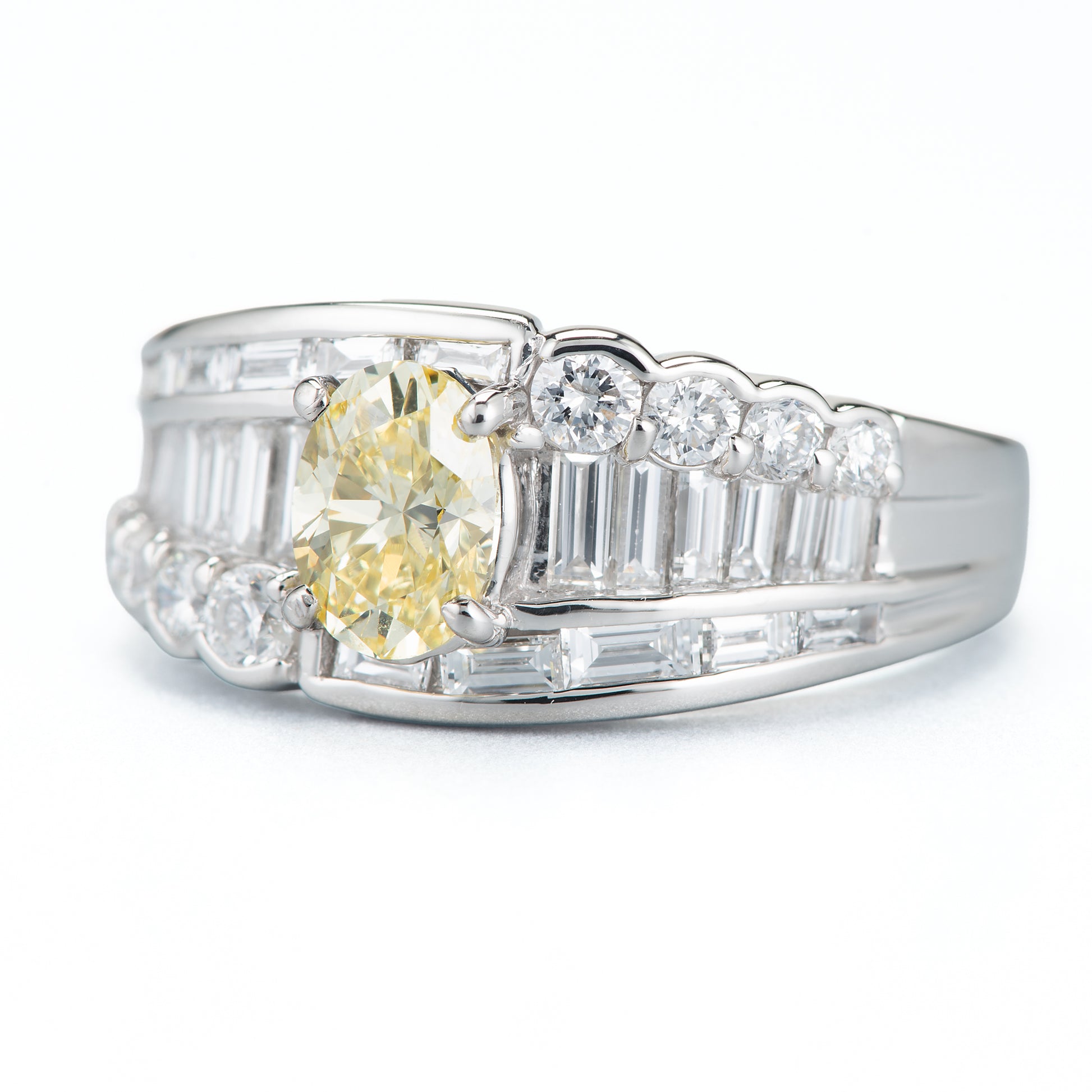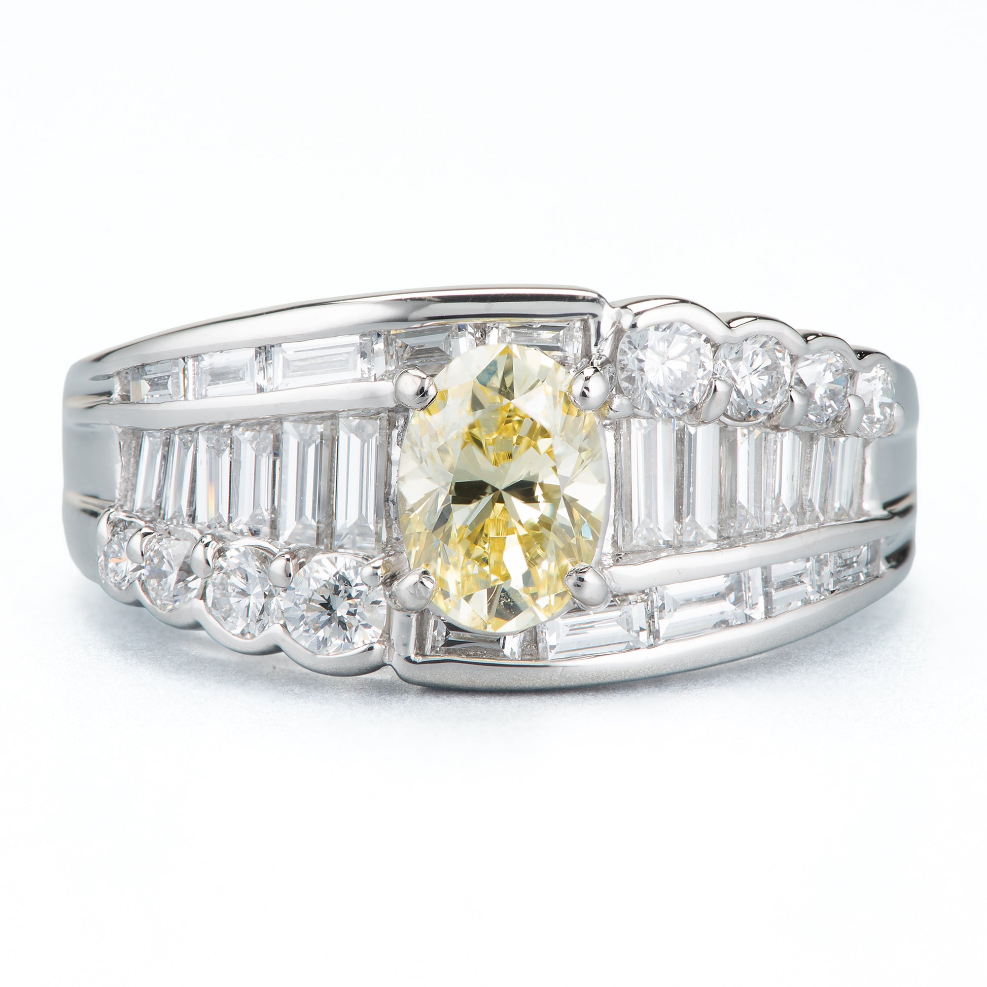 センターにセットされているのは、0.79ctのファンシーイエローダイヤモンド。