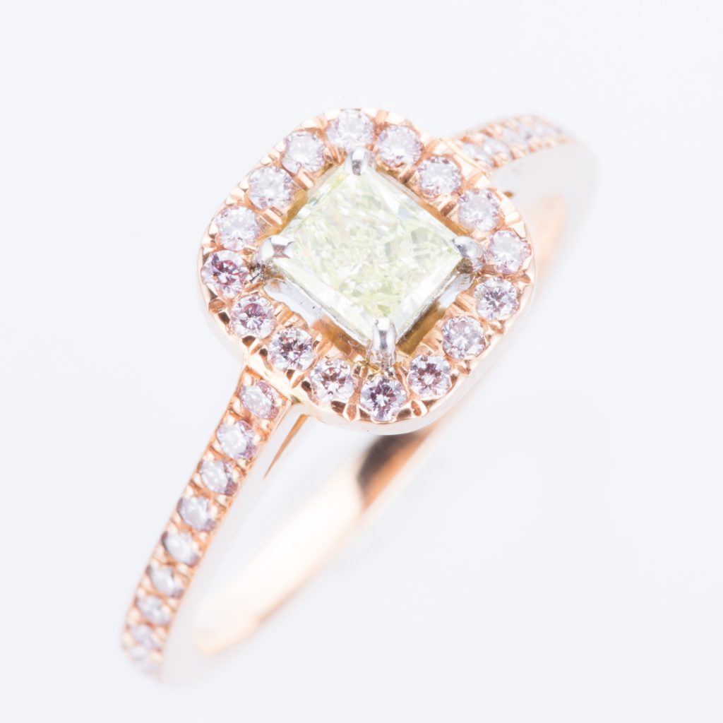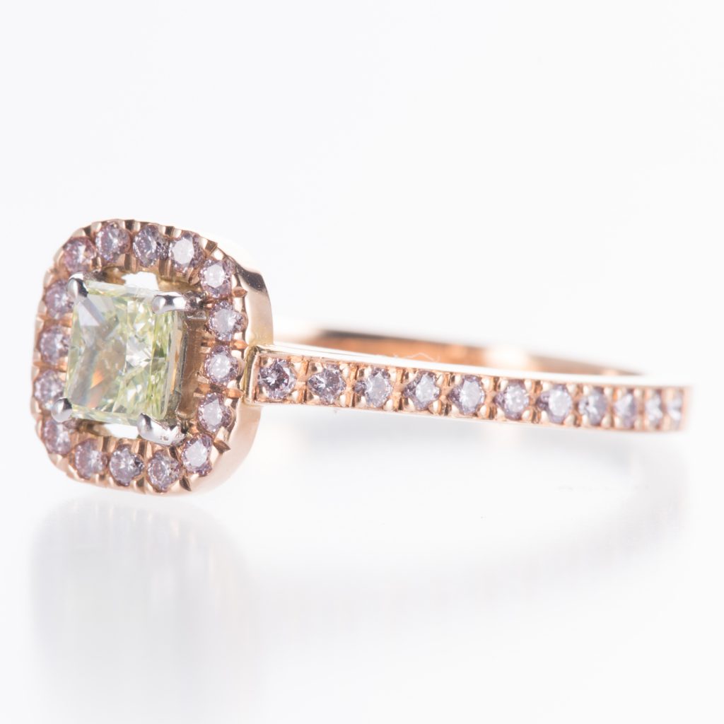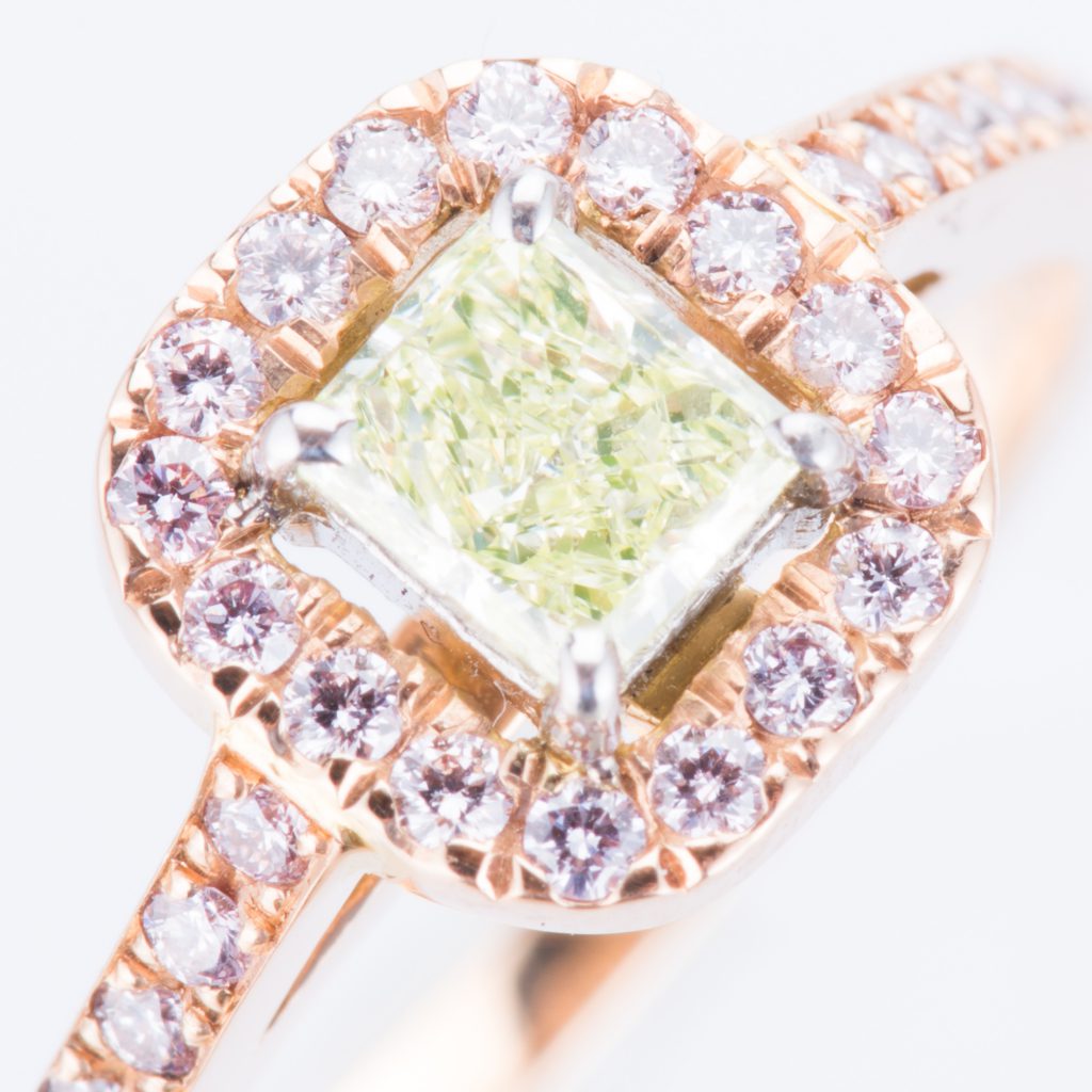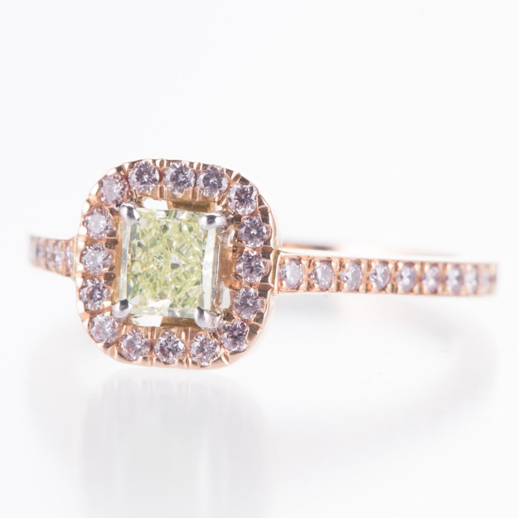 ファンシーグリーンイエローの周りにアーガイル鉱山のピンクダイヤモンドのカラーダイヤモンドをセッティングしたクラシカルデザインを再解釈したリングになります。