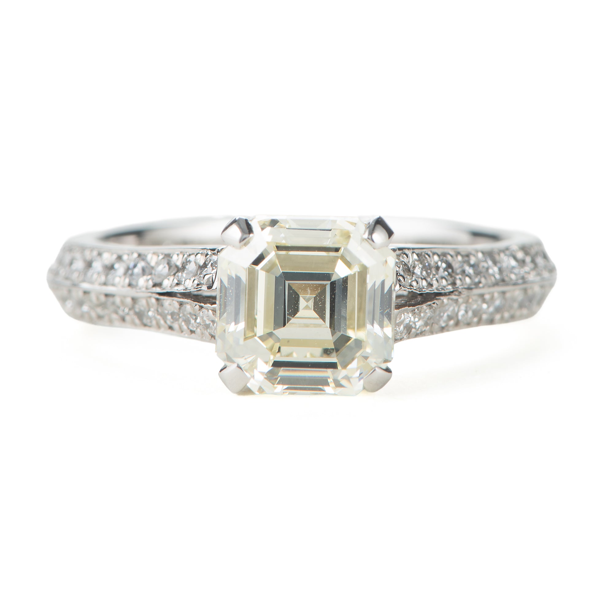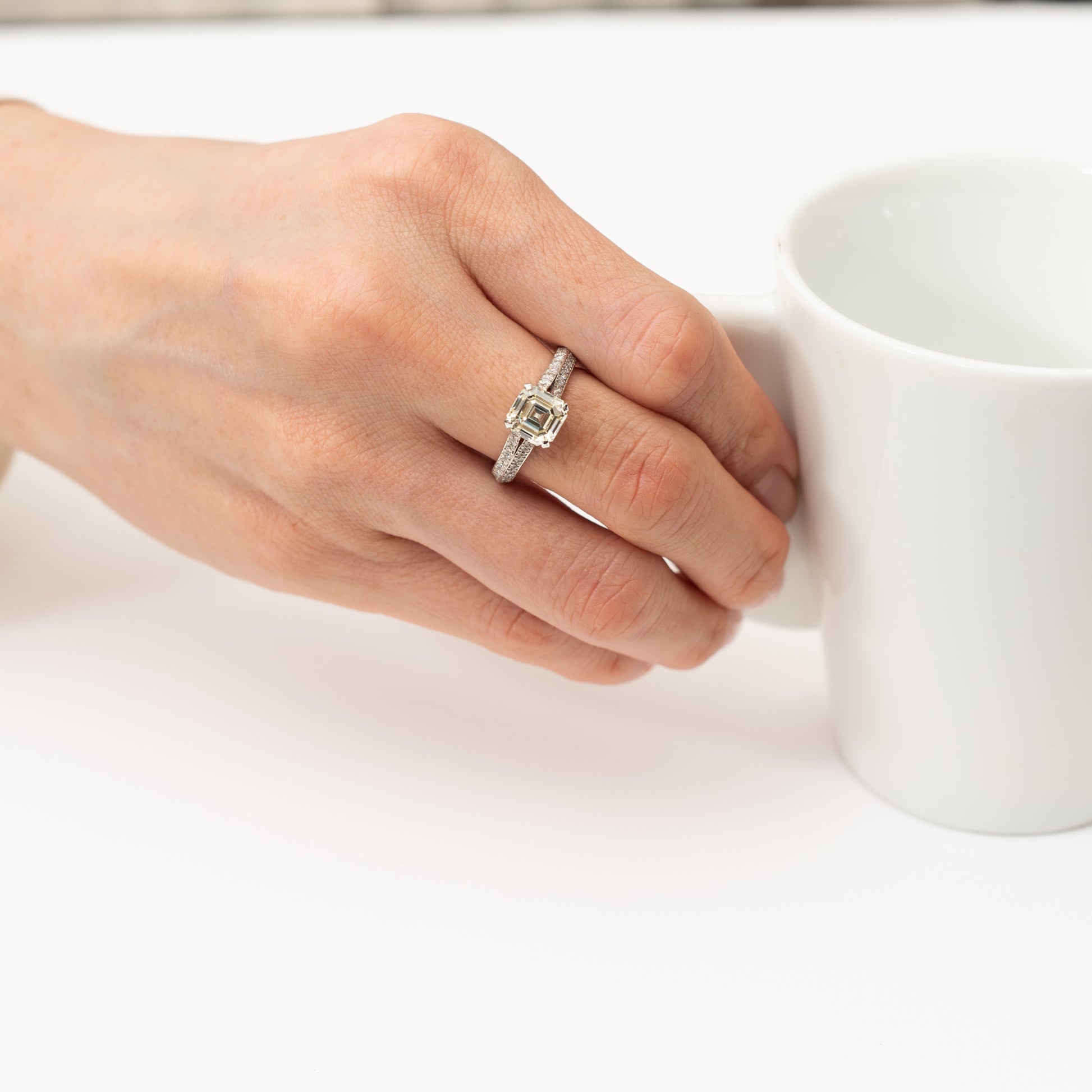 2.04ctのスクエアエメラルドカットダイヤモンドをセンターに配した、存在感あふれるプラチナ製リング。