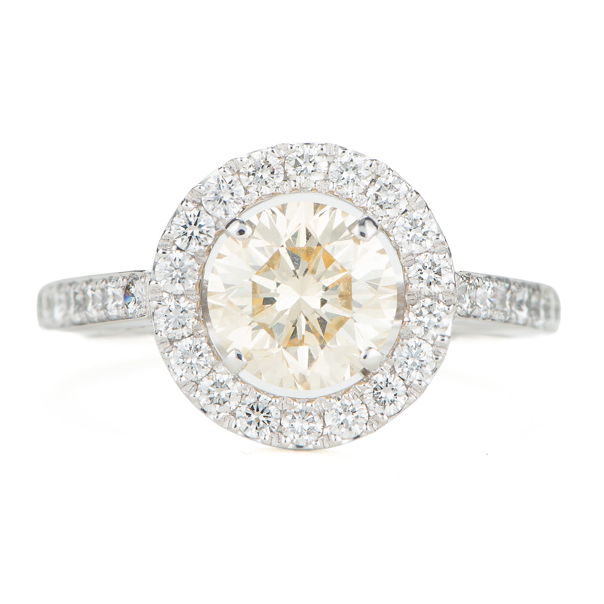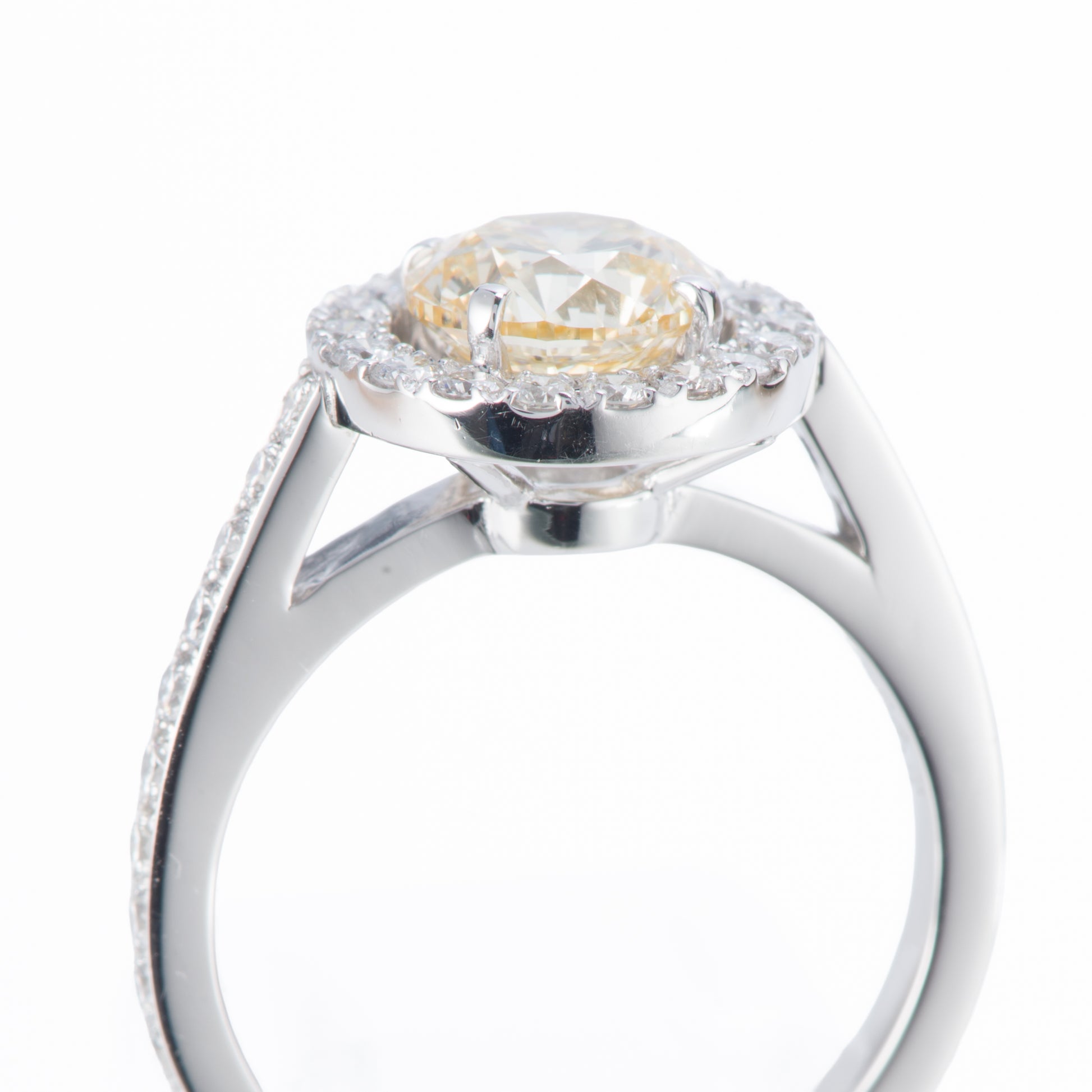 1.50ctのファンシーライトオレンジーイエローダイヤモンドを主役にしたハローデザインのプラチナ製リング。
