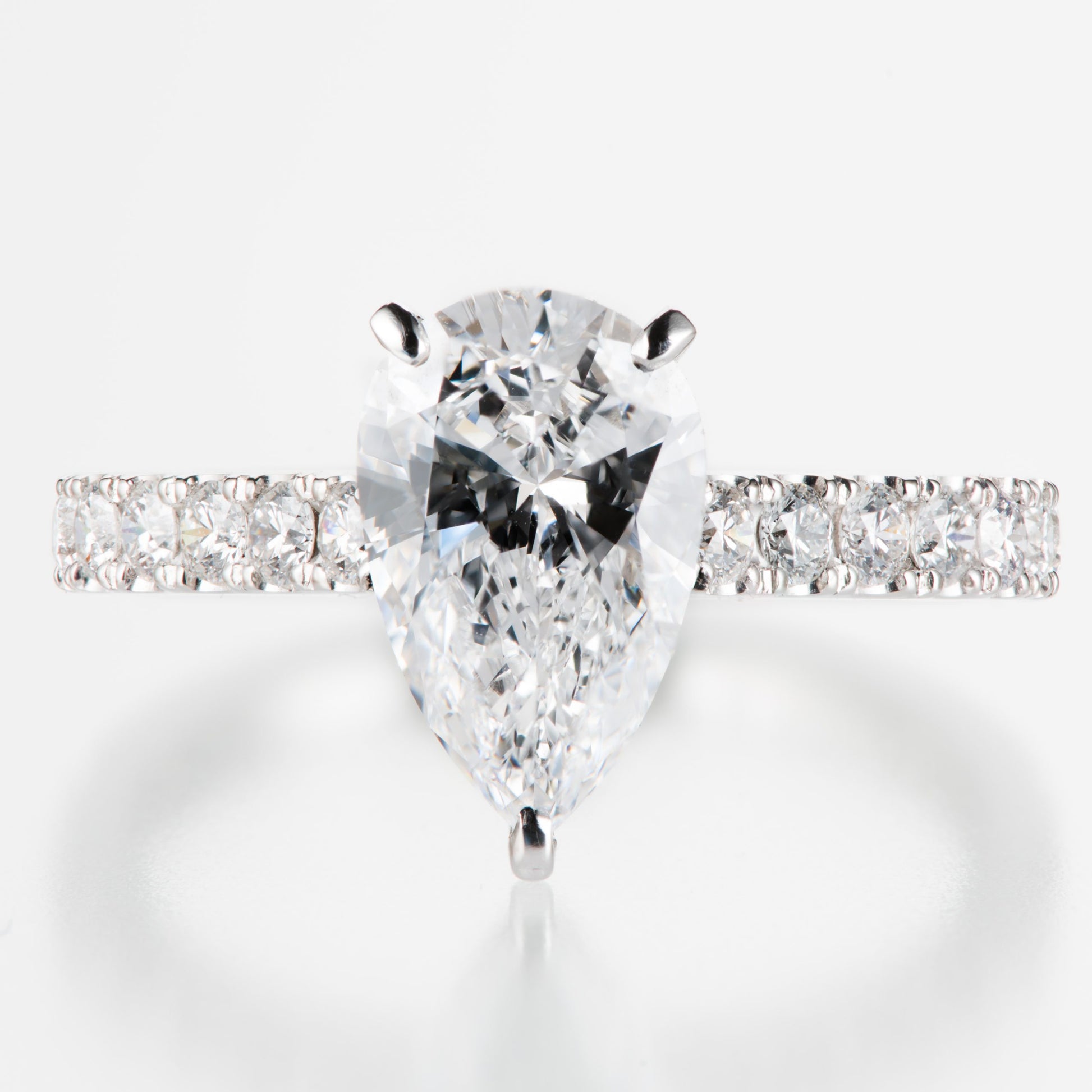 センターは1.73ct、カラーはDカラー、クラリティはインタナリーフローレス(IF)のペアシェイプをセット。トータルバランスが美しく、強い輝きを持つダイヤモンドになります。リングにF+、VS+、H&Qのトップクラスとダイヤモンドメレをセット