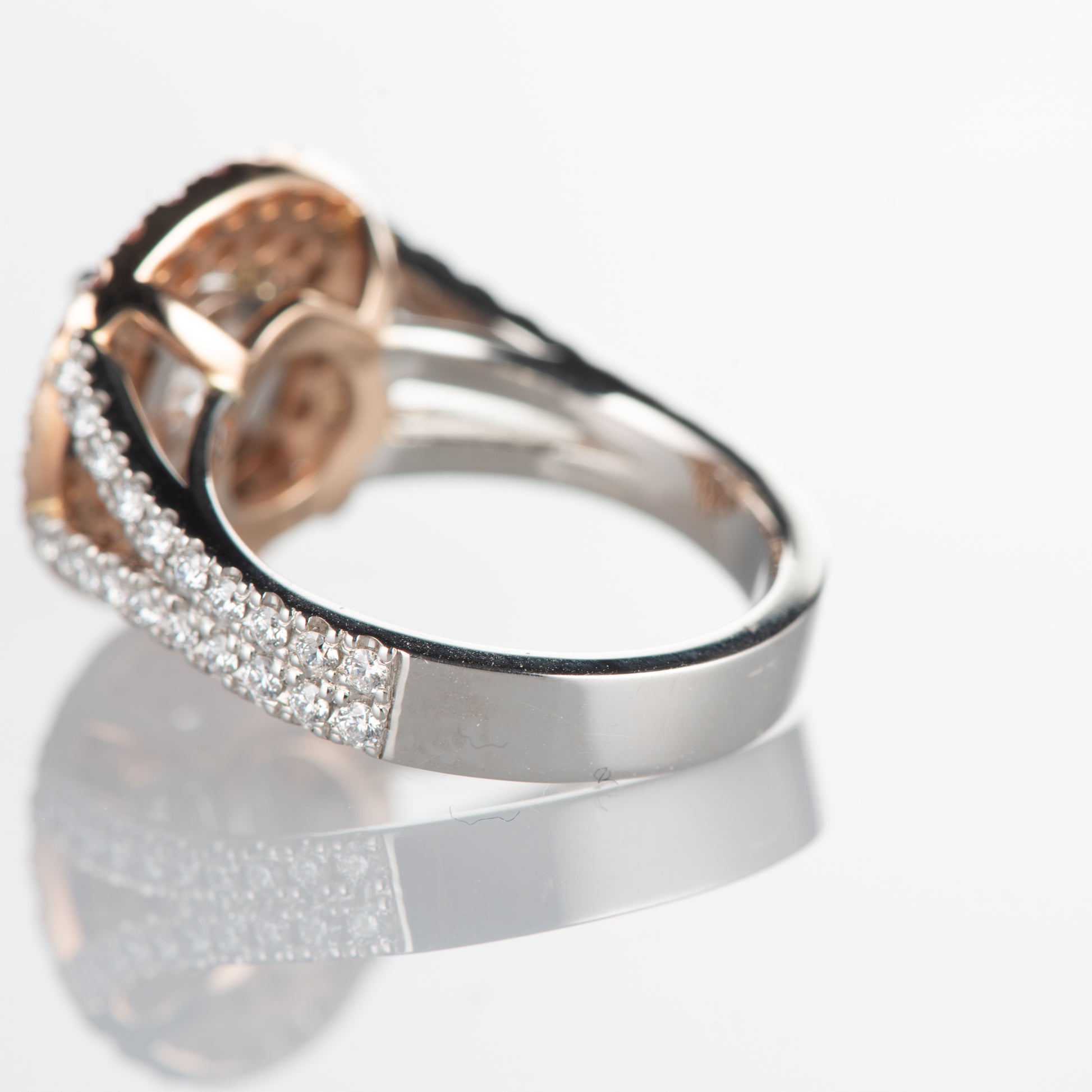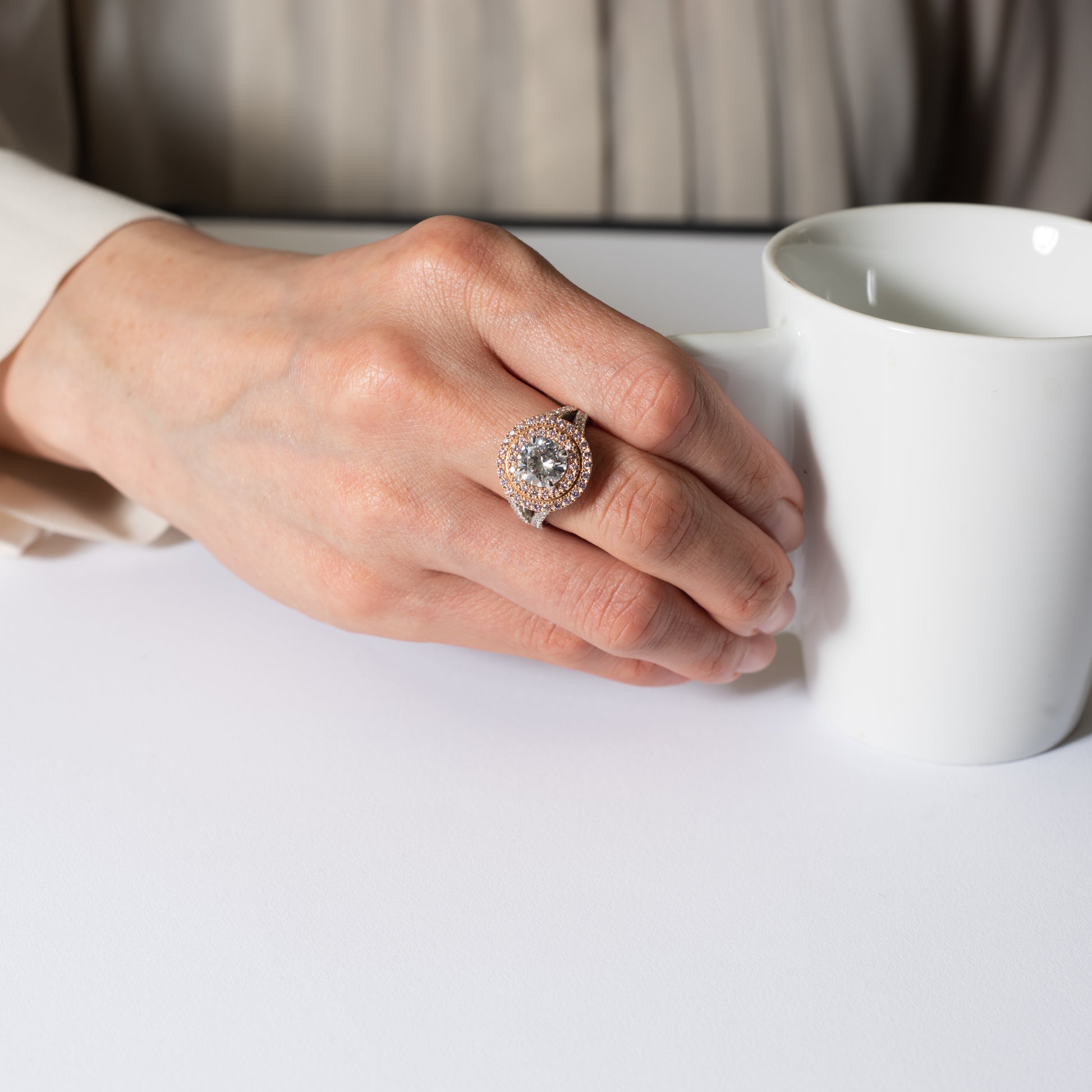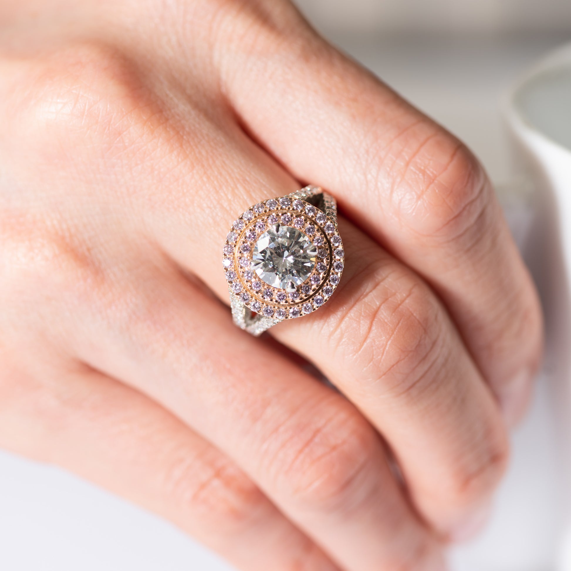 こちらのリングの二重のダイヤモンドパヴェにはアーガイル鉱山で採れたピンクダイヤモンドを使用しております。センターのダイヤモンドにふさわしい光の輪がセンターのダイヤモンドを引き立てます。