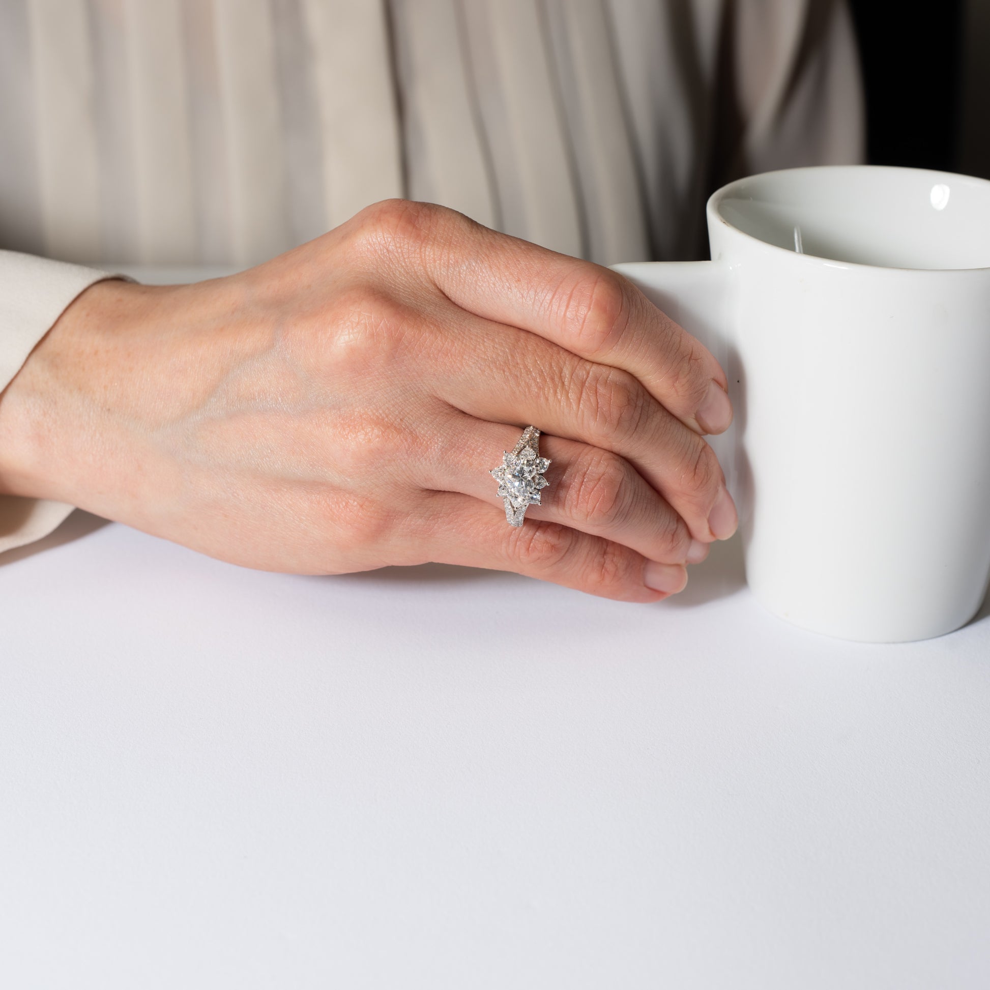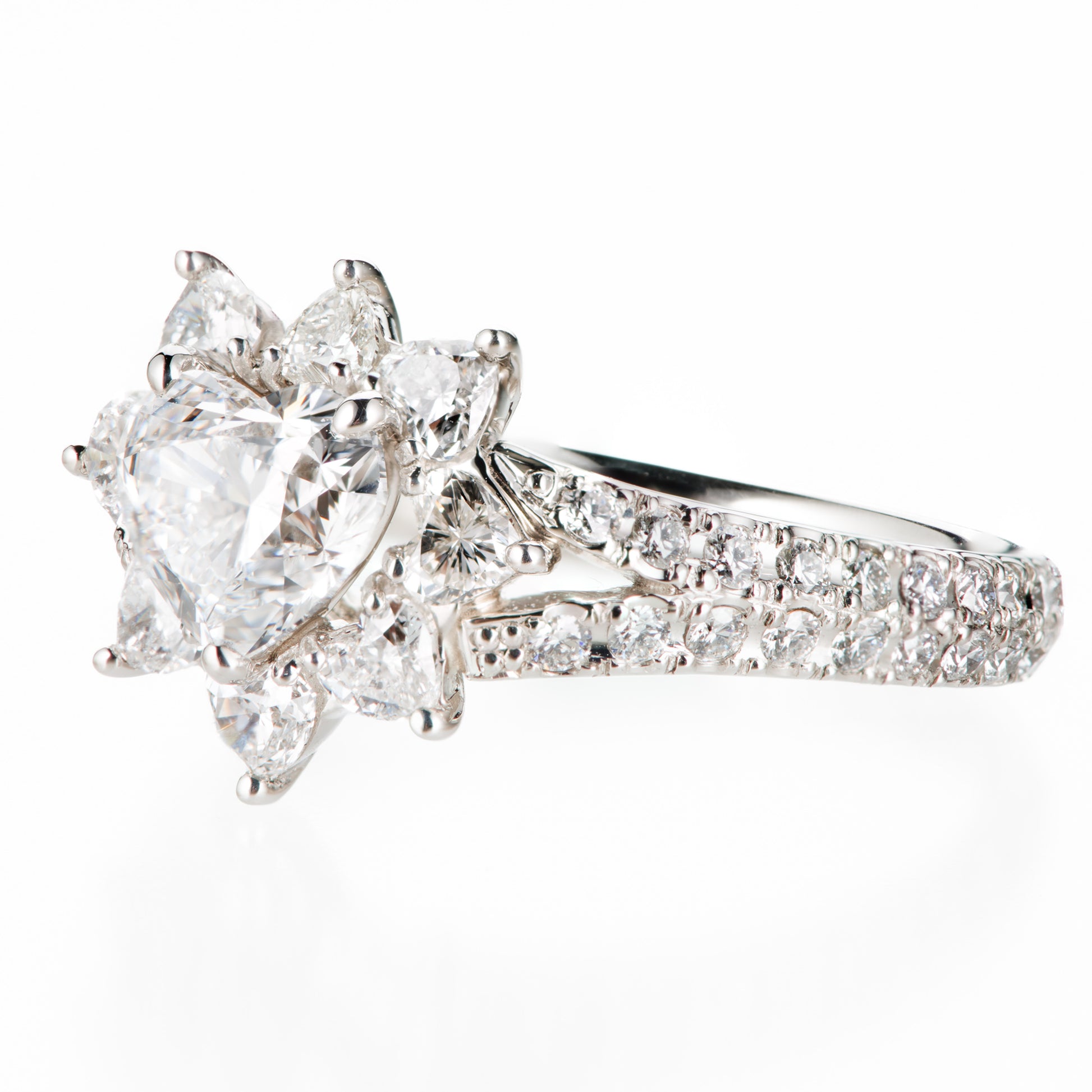 センターの1.01ct、Dカラー、VS1クラスのハートシェイプを8ピースのハートシェイプで取り囲んだリングになります。