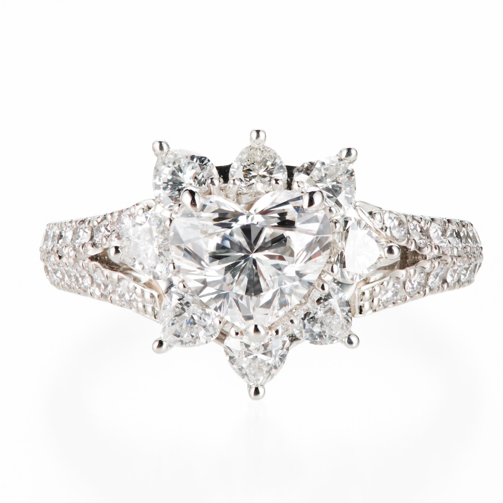 ベルギーからの直輸入のトータルバランスの美しいハートブリリアントカットのダイヤモンドとハートカットのダイヤモンドで取り巻いたデザインのリング。