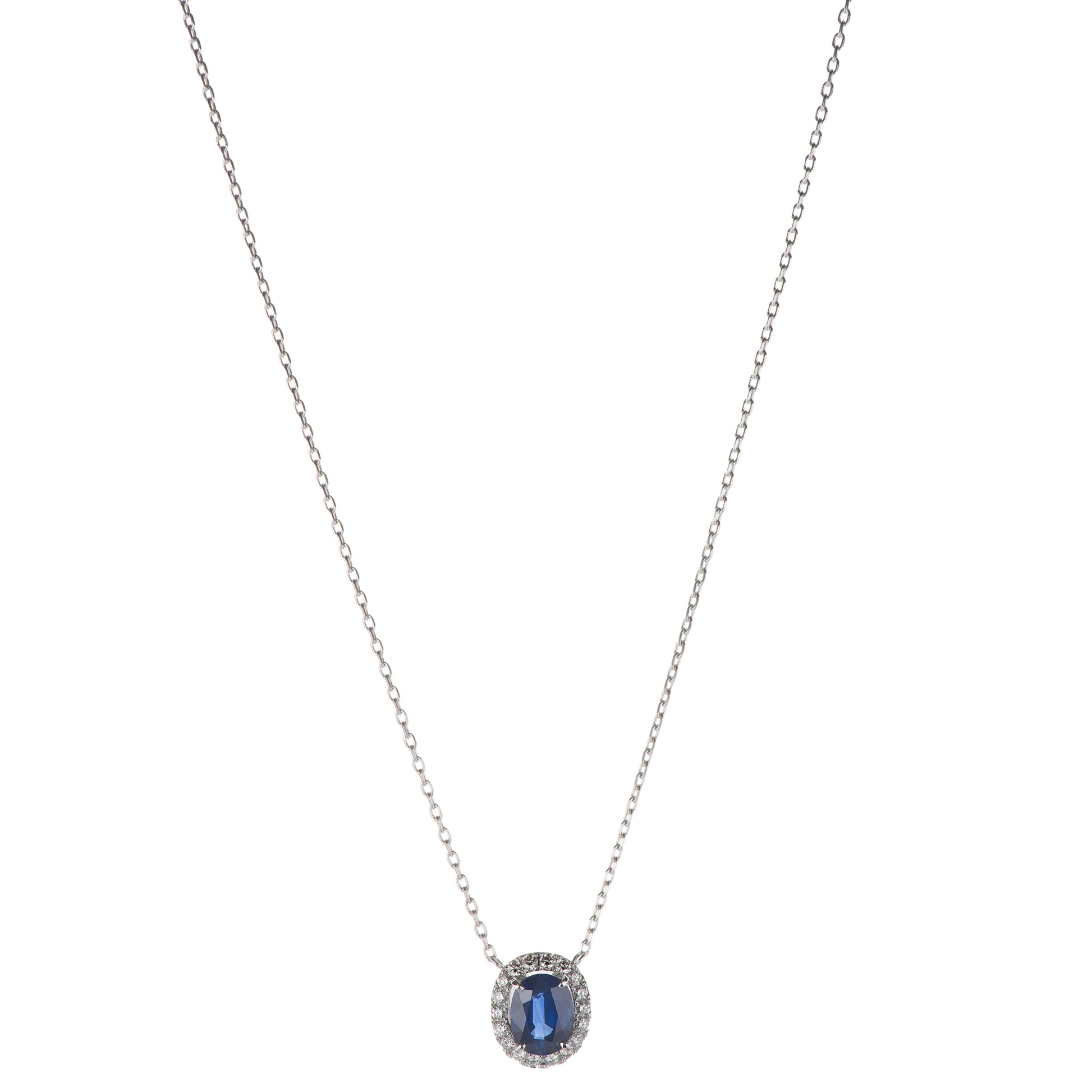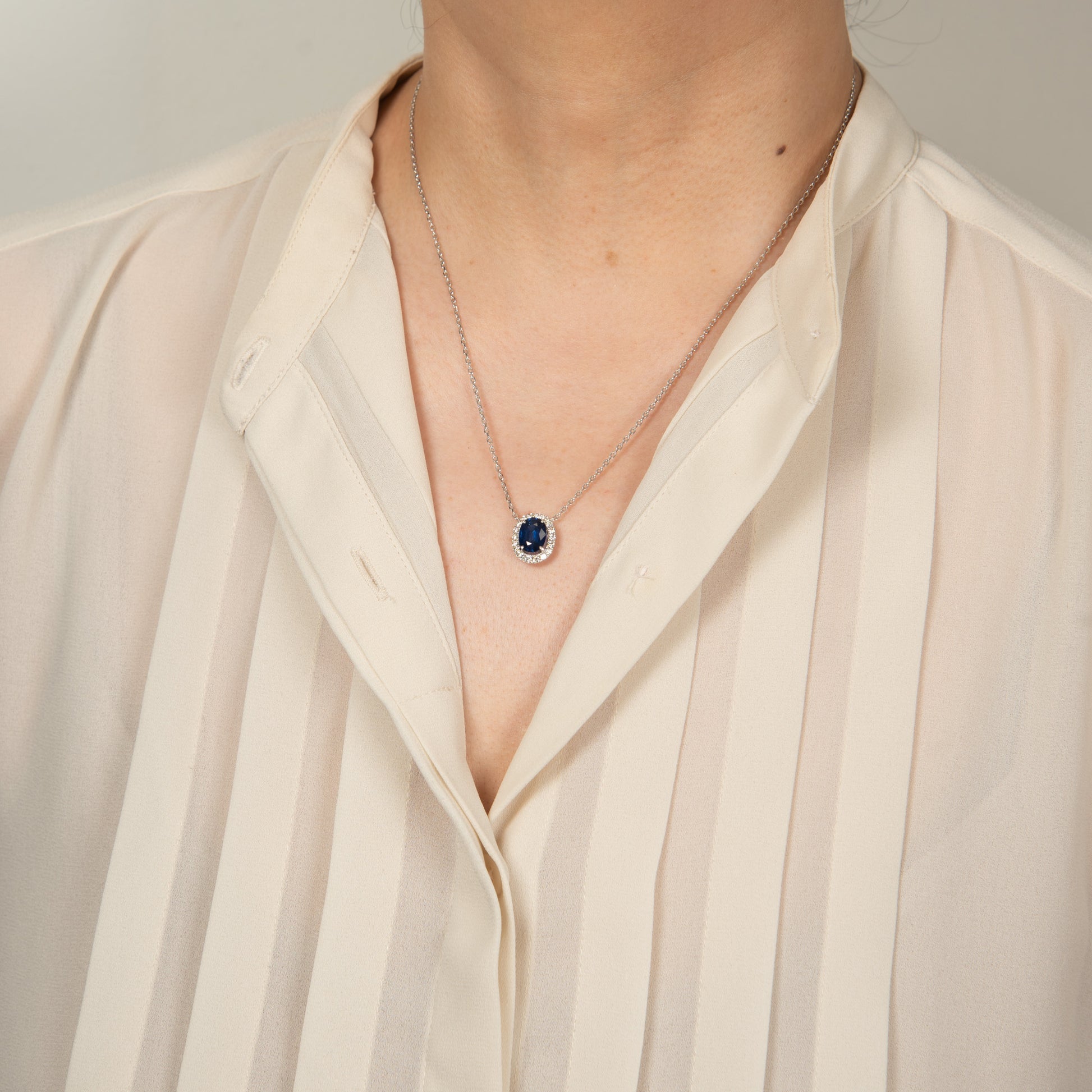 2.24ctのブルーサファイアセンターにセットしたハローデザインのプラチナ製ペンダント